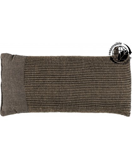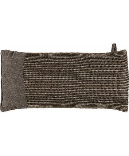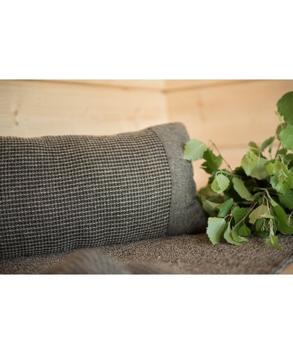 Brown curved Kenno sauna pillow with one-sided Chambray edging to support the head and neck on the sauna benches. Recycled cotton Kenno sauna textiles are characterized by the softness and lively texture of the fabric. Filled with quick-drying cotton wool. A lovely gift idea for saunas!