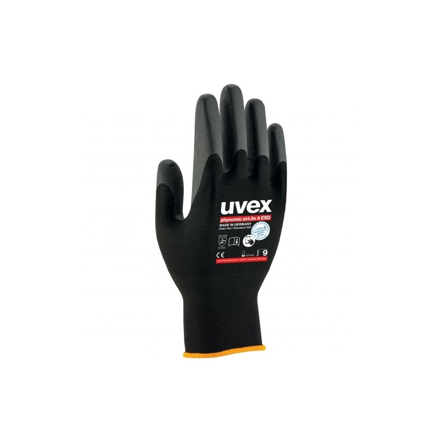 The safety glove for the fifth sense – with touchscreen compatibility and ESD function The uvex phynomic airLite A ESD is the lightest safety glove in its class and offers a noticeable difference in wearer comfort. The new assembly glove combines high sensitivity and tactile feel with lightness and breathability, all in one glove. This makes the uvex phynomic airLite A ESD perfect for precision work and handling very small or fine components — and you can still use almost all screens, tablets and mobile phones when you are wearing them.