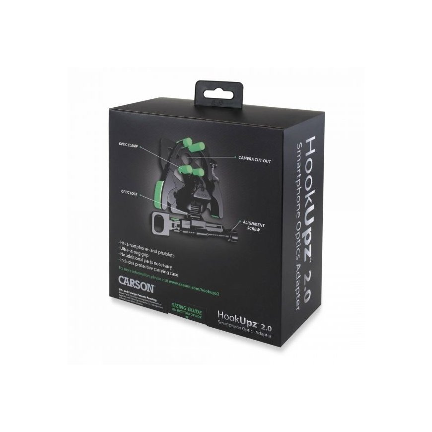 The patented HookUpz 2.0™ has been designed to accommodate all the popular smartphones on the market, including the larger sized phones and phablets — even with their cases on! It is super compact, lightweight and offers a user-friendly design. Connecting your smartphone or phablet to your optic is quick and easy. The exclusive, phone clamp and optic cam lock ensures a tight grip to both your phone and optic. It fits a wide range of optics with an outer eyepiece diameter of 25-58mm. Store the HookUpz 2.0™ in the included hard foam carrying case when not in use.