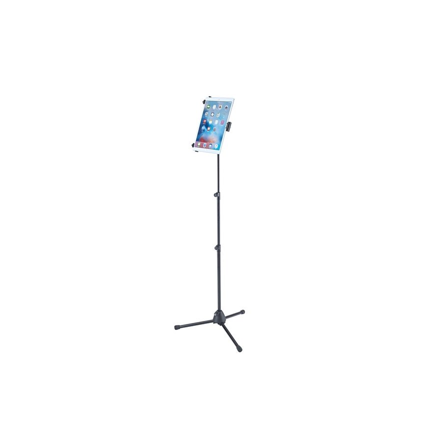 The combination of the stand and the Universal Tablet Holder supports you on stage, at home or in the studio. The individually adjustable support arms can accommodate the use of tablets ranging in height from 222 to 334 mm and width from 128 to 232 mm (for example iPad, iPad Air, iPad Pro, Amazon Fire HDX 8.9, Samsung Galaxy Tab from 9.7, Google Nexus 9, Asus Transformer or Microsoft Surface as well as Surface Pro). The depth of the tablets can vary between 6 and 11 mm. For the first use of the tablet holder the support arms settings are made by adjusting the clamp screws to the size and depth of the tablet. For other uses the tablet can be attached and detached quickly and simply through a snap lock. A handy wing nut allows one to adjust the angle, so that each user will easily be able to find their ideal individual position. The tablet can switch between portrait and landscape positions. The tablet is kept in place, there is no danger of the tablet switching position by itself. The light and expandable stand can be adjusted to any height between 70 and 155 cm. A small and compact footprint makes this stand easy to transport.