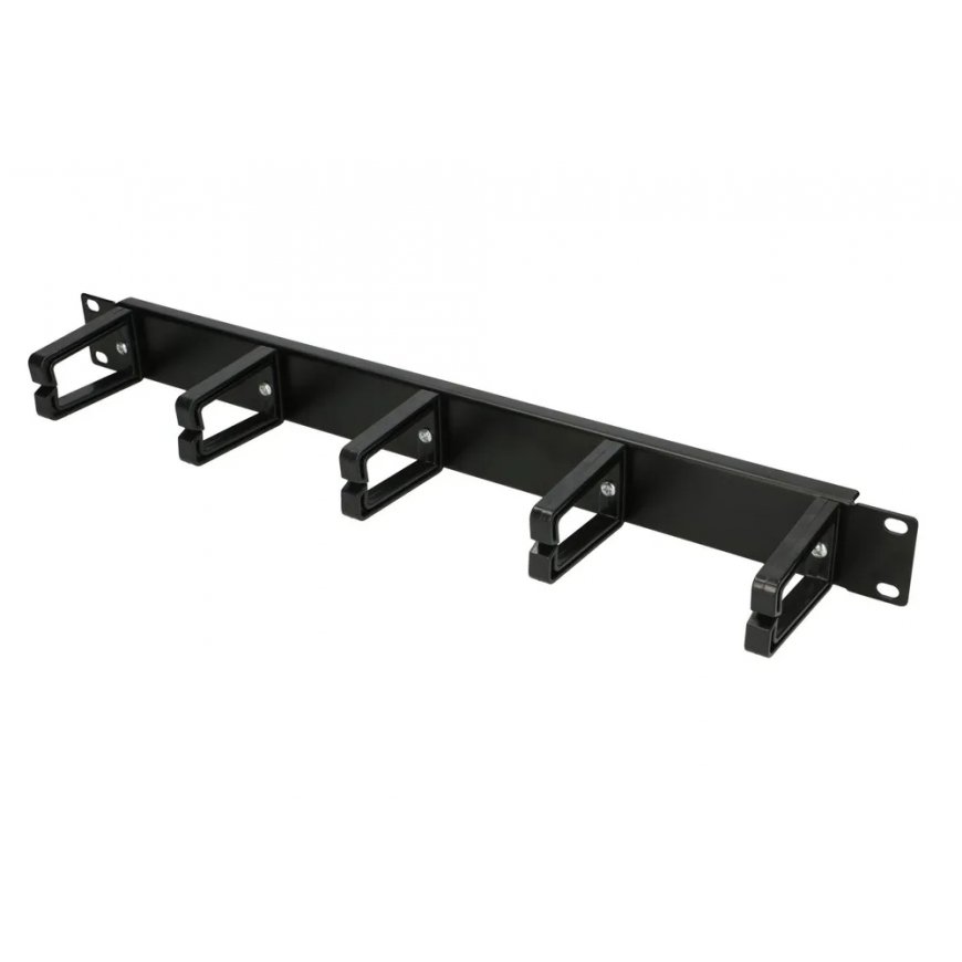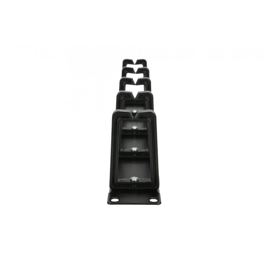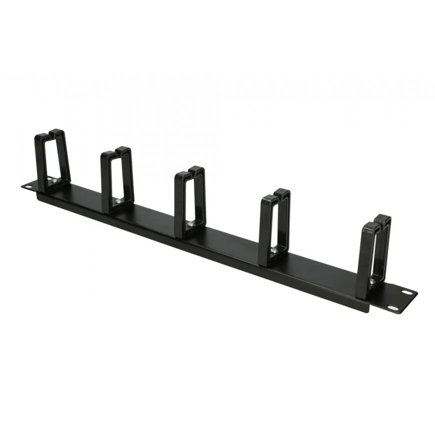 Extralink 1U cable organiser with plastic handles Cable organizer designed for 19" racks, allows to run patchcords connecting individual network components like switch or patchpanel. Similarly to many network devices, it is mounted butt mounted to rack rails and occupies 1U. It is equipped with 5 plastic supports that allow easy cable entry. Organizer allows you to run horizontal cables from one side of the rack to the other or aesthetically arrange the cables coming out of the active device ports. It can be used with both copper and fiber optic cables.