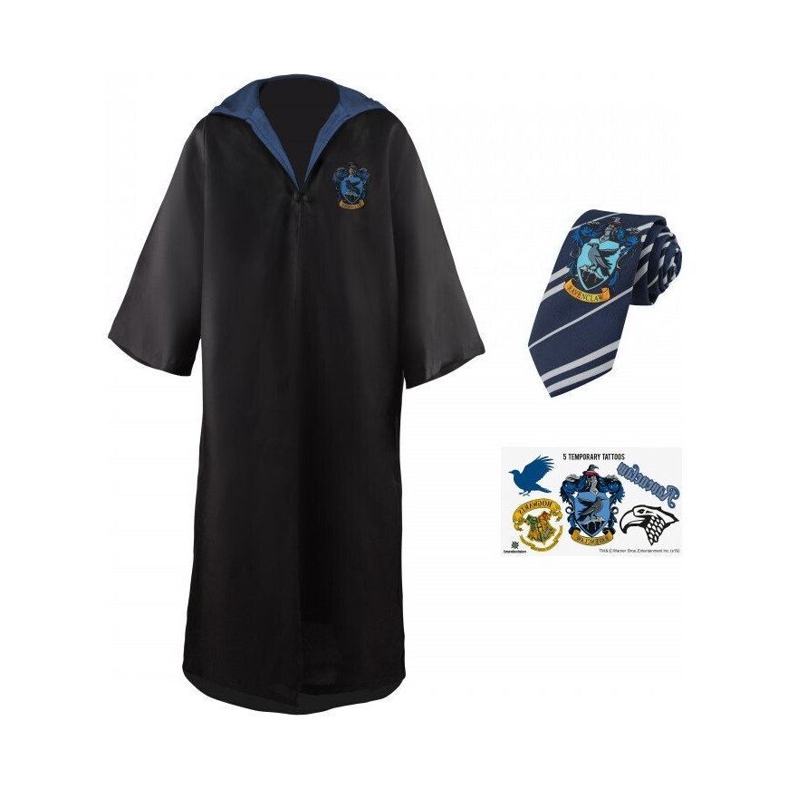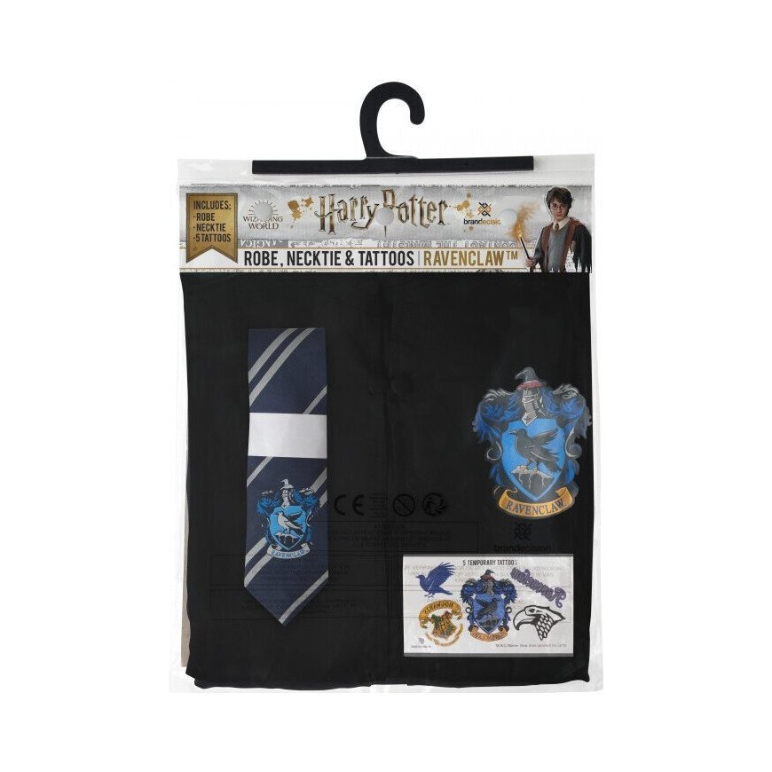 The Cinereplicas Harry Potter Raven Nail Wizard is the perfect outfit for all Harry Potter fans! The package includes a wizard's robe, a tie and a Korpinkynsi transfer tattoo. The hood is decorated with Korpinkailni symbols and is perfect for masquerades, for example!