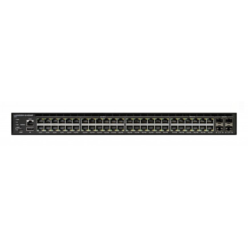 High performance on 54 ports The LANCOM GS-4554XP is equipped with 12x 2.5 multi-Gigabit PoE+ Ethernet ports, 36x Gigabit PoE+ Ethernet ports, as well as 4 SFP+ and 2 QSFP+ FleX ports supporting transmission rates of 10 and 40 Gbps respectively. In addition, with a data throughput of 372 Gbps on the backplane, it offers wirespeed performance even at high workloads. The multi-Gigabit access switch thus forms the powerful basis for modern network infrastructures in all industries and areas of application.