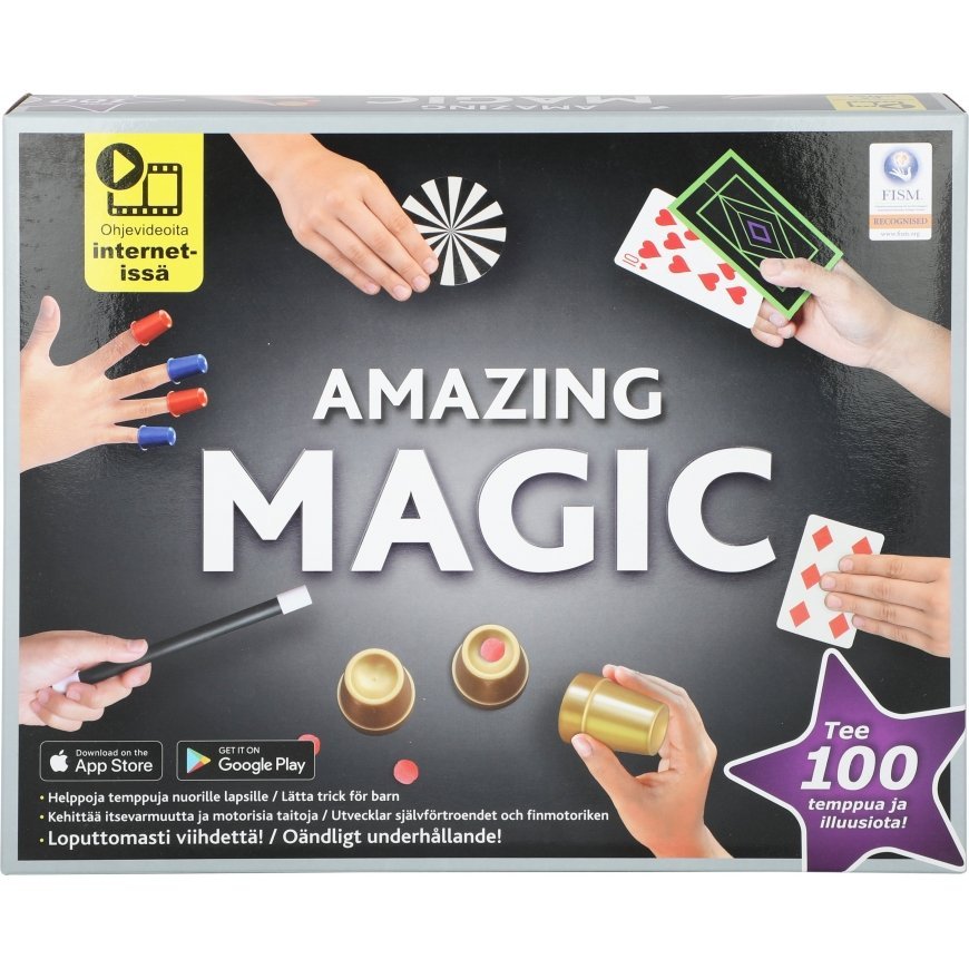 With this 100-trick Magic Set, you can learn amazing magic tricks in minutes. Perform dazzling card tricks, make coins multiply or even appear out of thin air. Objects can disappear in your hands and reappear and even change. Timeless tricks like cups and balls. And much, much more! Contains instructions in Finnish and Swedish for a hundred magic tricks and illusions.
