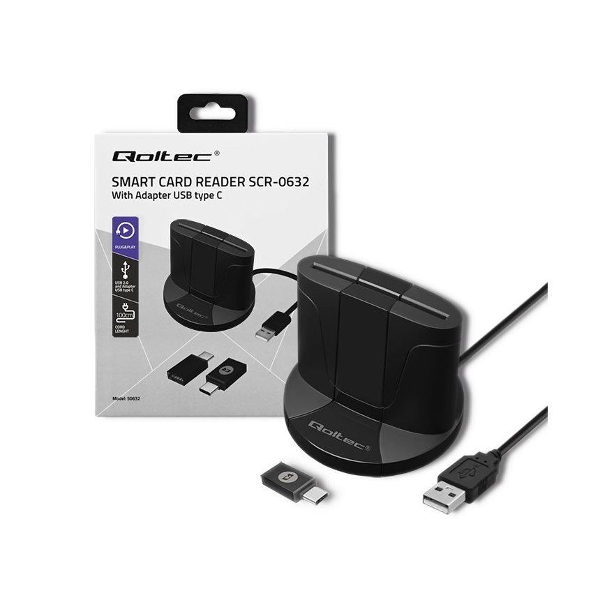 Qoltec Intelligent Smart ID chip card reader SCR-0632 | USB type C Smart ID chip card reader is a device that allows you to read data from smart cards quickly and without the need to install additional software.