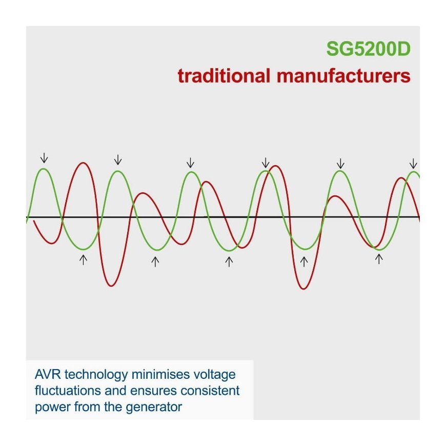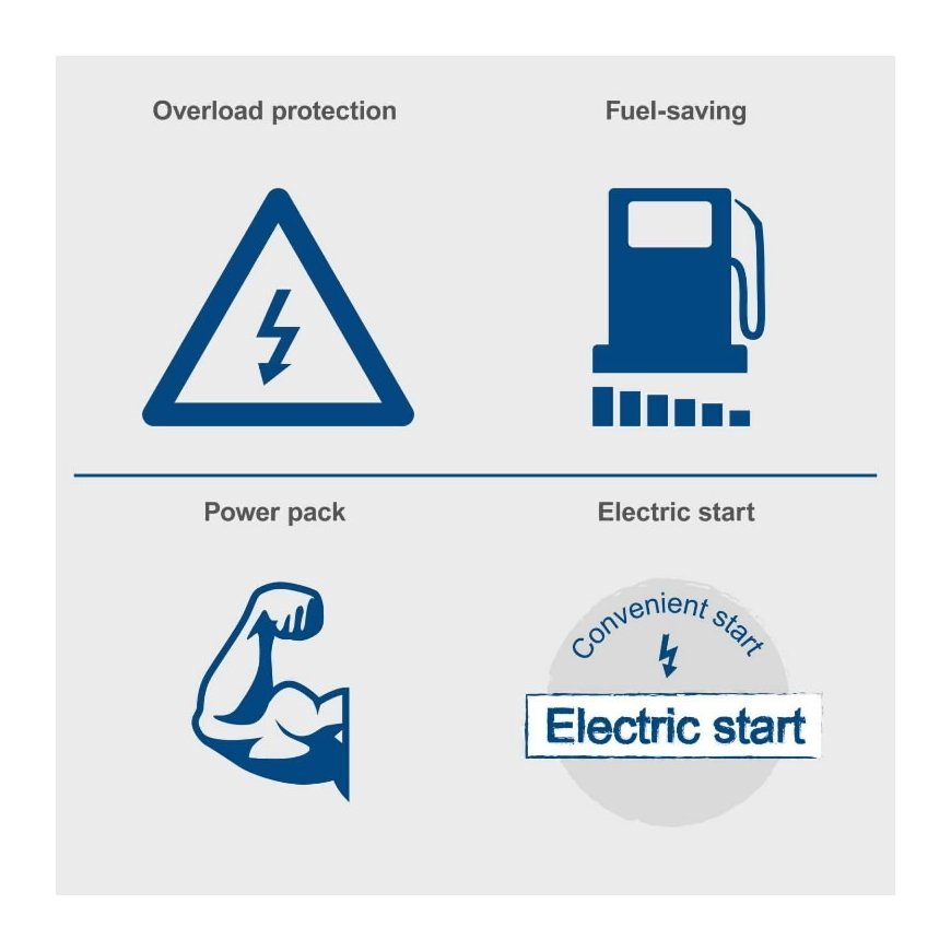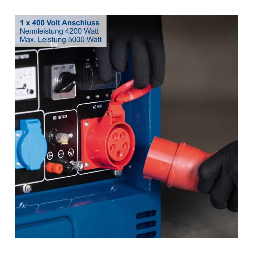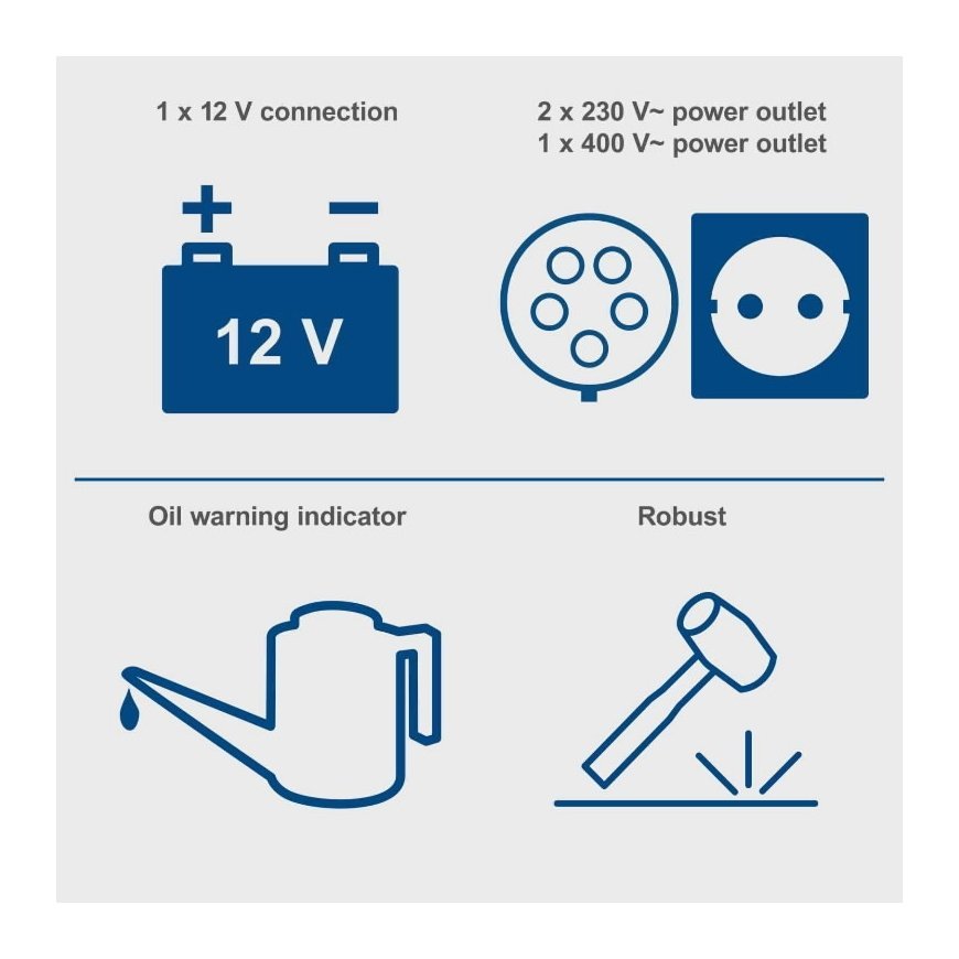 Output power/max 5000/5500 W 400V AVR voltage stabilizer 2x230V plug 1x400V plug Overload protection Low oil pressure protection Voltmeter Tank 16 liters fuel consumption at 75% load capacity 1.43 L/h Electric starter Dimensions: 920 x 520 x 750 mm Weight 148 kg