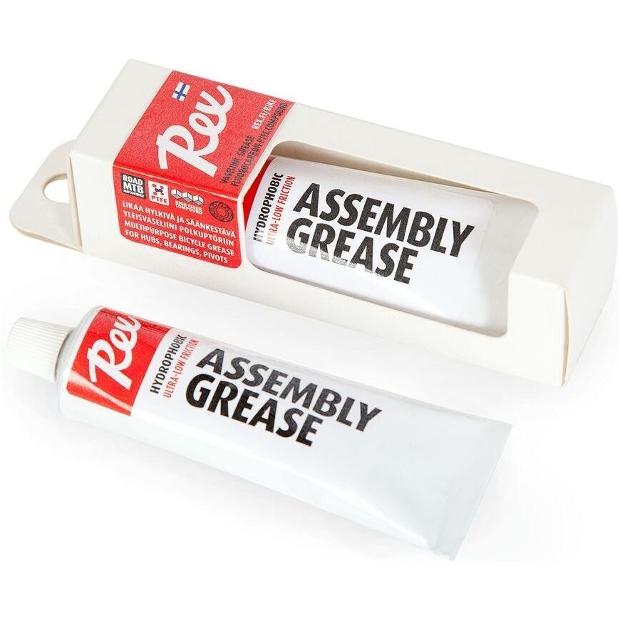 REX Assembly Grease universal vaseline for bikes is made from a unique recipe, which uses the same ingredients used in high-fluorine ski creams as in Rex Domestique chain oil, which has become popular among cyclists. This gives Assembly Grease the good properties known from chain oil, such as extremely low friction in metal-to-metal applications, excellent film-forming ability and protection against weather conditions. Assembly Grease is not based on industrial petroleum jelly, but is made at the manufacturer's factory in Hartola from the purest available waxes, petroleum jelly and oils.