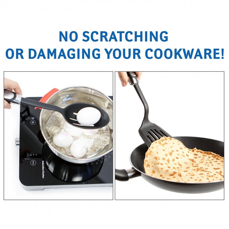 Tatkraft GRIP kitchen utensils set of 14 Pcs includes: Spoon, Slotted Spoon, Whisk, Slotted Turner, Peeler, Can Opener, 4 Measuring Cups (1/4 cup, 1/3 cup, 1/2 cup, 1 cup), 4 Measuring Spoons (1/4 tsp, 1/2 tsp, 1 tsp, 1 tbsp). Kitchen tools are made from durable materials - heatproof flexible nylon (210Β°/400F) and high quality stainless steel. All gadgets are nonstick, do not scratch or damage your cookware. Dishwasher safe. Comfortable to use due to ergonomic easy grip handle. Convenient to store on railing having at hand all you need for effective and pleasant cooking.