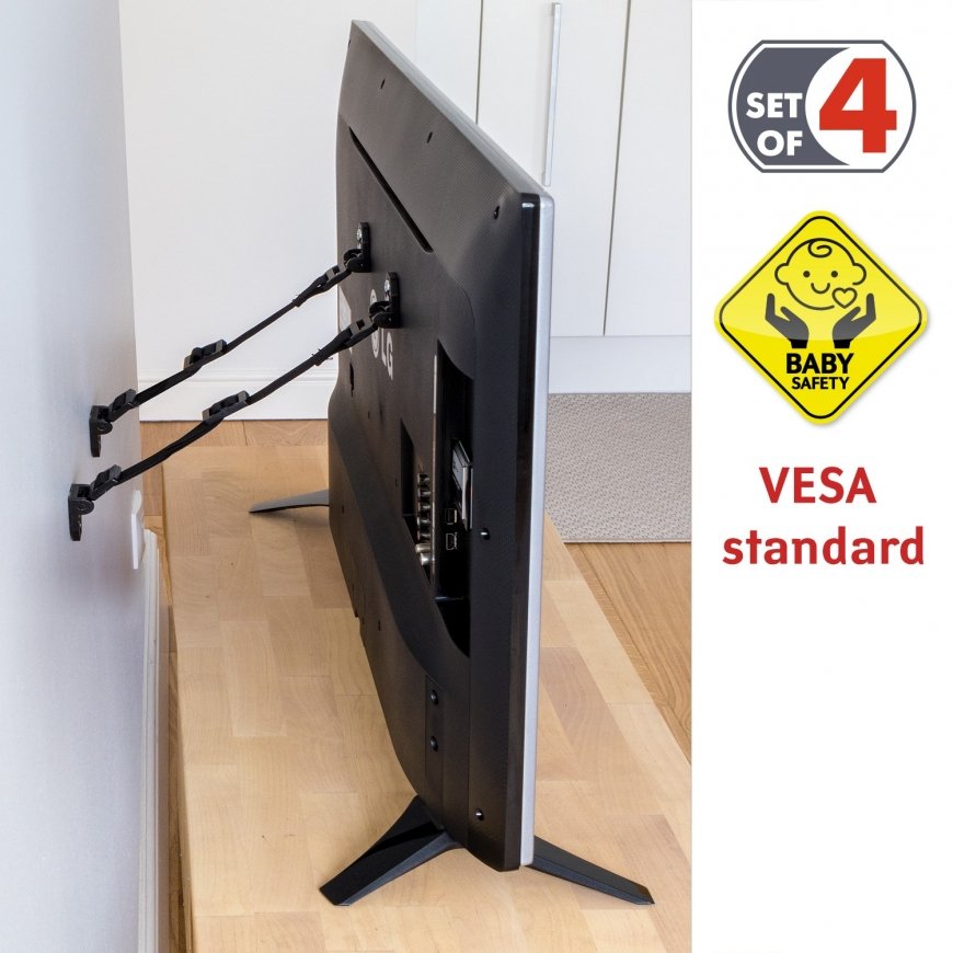 STRESS FREE: Having a safety strap reduces the risk of children or pets from tipping the TV forward and damaging itself. If you have children at home then this will minimize the risk of a child tipping the TV forward. You can adjust the straps to have a higher tension to hold the TV more firmly. QUALITY MATERIALS - High quality ABS and triple stitched nylon materials - stronger than average plastics and velcro. Firmly secure TVs, cupboards and other furniture, refrigerator, ovens, toilet seats, trash cans, etc. MOUNTING HARDWARE INCLUDED: all the necessary hardware to mount your flat screen TV or Furniture secure to the wall or TV stand. Two straps required for each TV or furniture, set includes 4 straps (2 whites, 2 blacks). COMPATIBLE WITH MOST TV'S: Most televisions have holes on the reverse for screws; as long as these are present on your TV the wall mounts can be applied. OUR 100% MONEY BACK GUARANTEE: If for any reason you are not fully satisfied with your purchase, simply apply for a complete refund