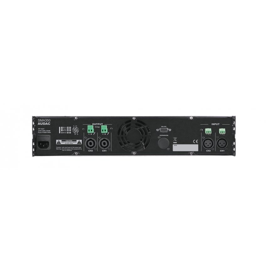 The SMA Series are dual channel (stereo) power amplifiers providing a new standard for affordable audio amplification in both fixed and mobile audio installations. Their advanced features and availability in different output powers for 350 Watt, 500 Watt and 750 Watt provide an enormous flexibility for numerous applications. The WaveDynamics™ DSP processor in combination with the 2.5” LCD display gives an unmatched user experience with intuitive functions overview for easy configuration. Acoustics can be optimized using Butterworth, Bessel and Linkwitz-Riley filters with selectable rolloff which can be configured as Low / High & Band Pass and the 7-Band equalizer which has adjustable frequencies and Q-factor. Other provided functions are delay and dynamic bass boost. These settings can be custom configured using the front panel of the amplifier, whereby access can be given on two different levels (User & Administrator) using password or USB-key protection. Loudspeaker protection is provided by an output power limiter whereby the maximum output power for every channel (in Watt) can be configured. Configuration is made simple with loudspeaker presets and full system configurations which can be selected from a library and uploaded with an USB flash drive. This ensures the best acoustical performance with a bullet-proof loudspeaker protection. A great input flexibility and source compatibility is provided by the input selection matrix in combination with the XLR and terminal block signal connections. The outputs are made using Speaker and Terminal block connections. System integration is made easy using the RS-232 control port. An optional Dante™ interface is available for the WaveDynamics™ amplifiers. The installation of this network interface allows receiving and sending of low latency, high quality audio over a standard Ethernet network.