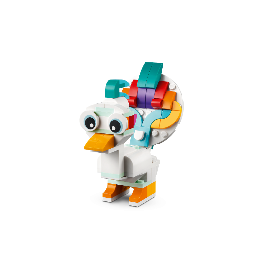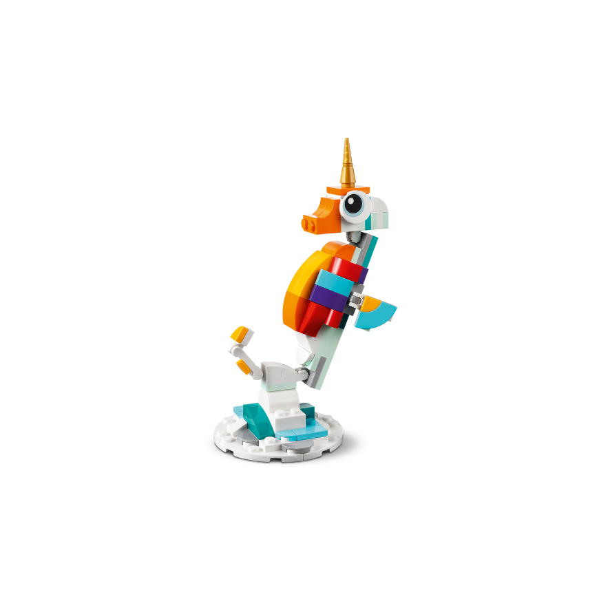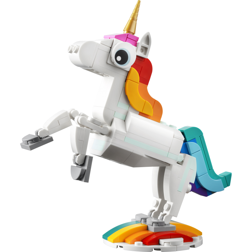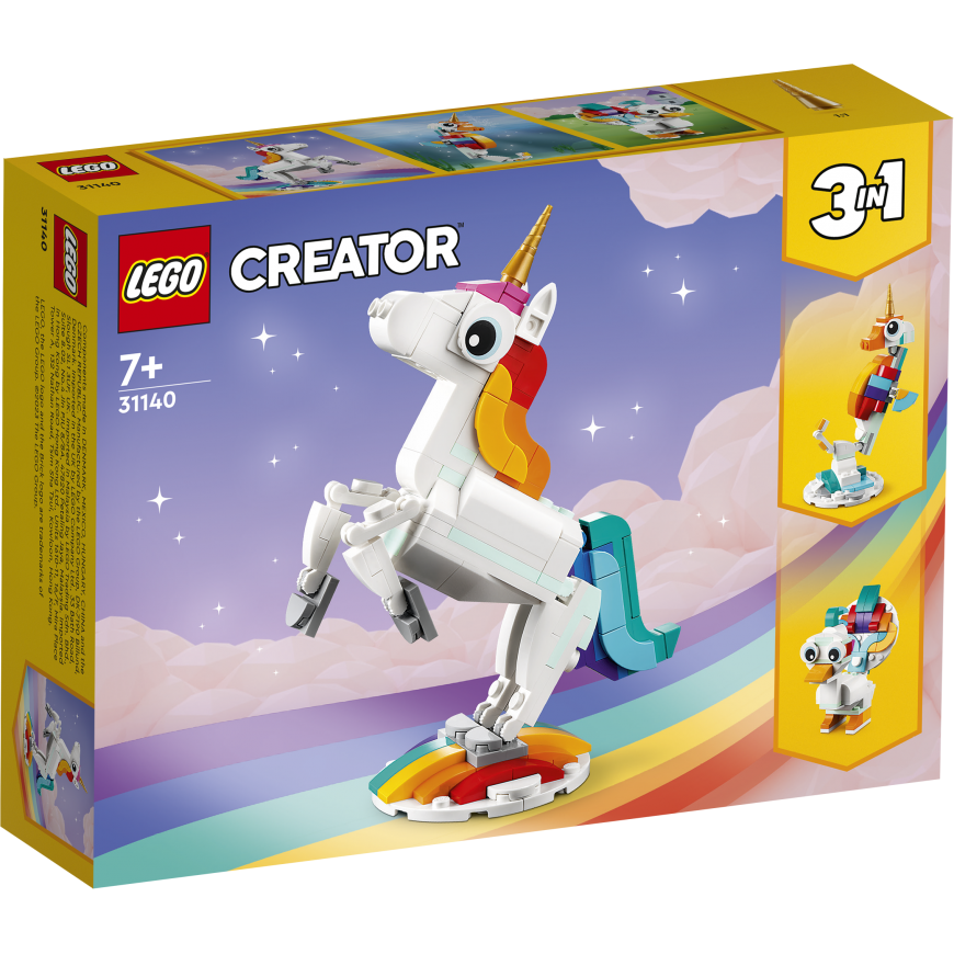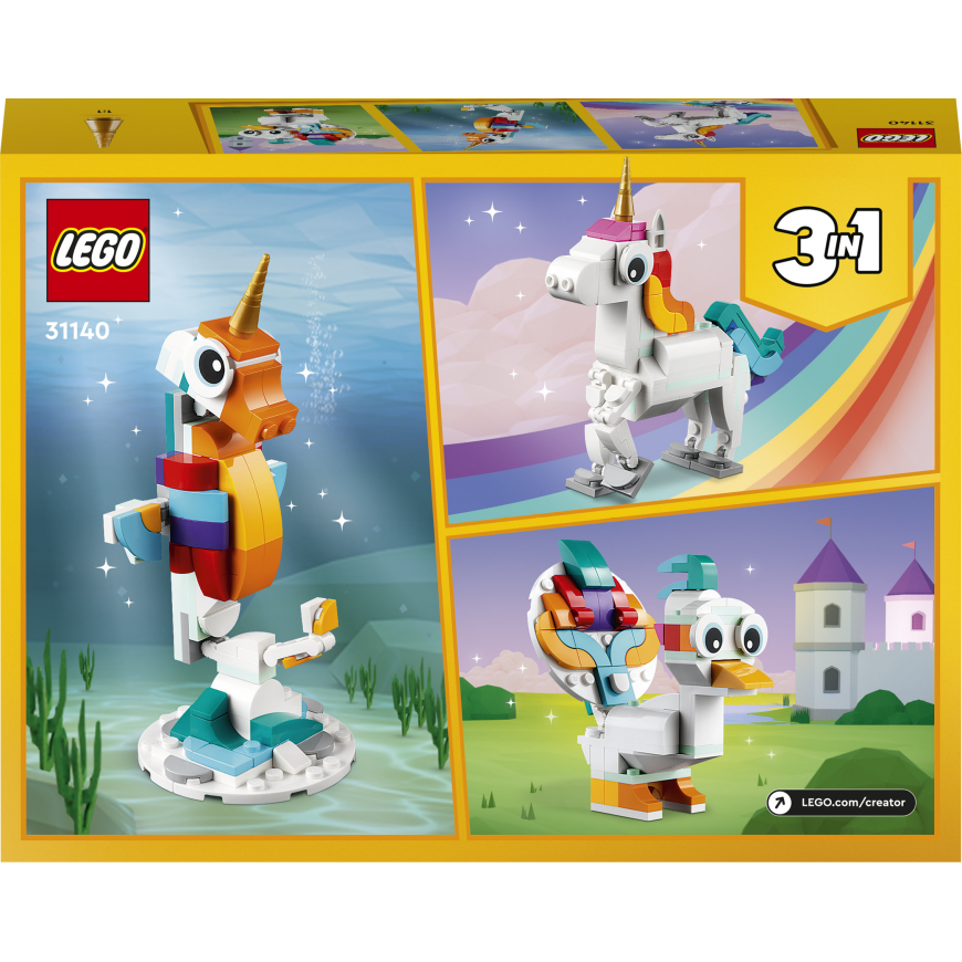 • Three magical creatures in one set – little builders can create and rebuild three different colorful models with this LEGO® Creator 3in1 Magical Unicorn (31140) playset • Joy of play that lasts for a long time - children can create great stories in a mythical land in three different scenes: ride a rainbow along a magical unicorn, swim with a seahorse or play with a peacock • Poseable models - all three creatures have movable body parts: the unicorn can move its legs and hooves, the seahorse has a movable tail, fin and head, and the peacock has a movable tail and eyes • Play and display – all three durable magical animals can be easily displayed: a unicorn on a rainbow base, a toy seahorse on a seabed base and a toy peacock on two legs • Building fun – this 145-piece playset offers children aged 7 and up first an enjoyable building task and then creative play, and can also be given as an unexpected surprise, birthday or holiday gift • Play anywhere - kids can play with the over 13 cm tall magical unicorn at home or put it in their bag and take it with them on trips • Fun 3-in-1 play – look for other LEGO® Creator 3in1 playsets, such as a retro motorbike (31135), an exotic parrot (31136) and a motorhome for a beach trip (31138) • Helping hand – find intuitive building instructions in the LEGO® Builder app, where kids can zoom and rotate models in 3D view, track their progress and save sets while developing new skills • Excellent quality – LEGO® bricks have been built for over six decades to always be easy to separate • Guaranteed safety – LEGO® building blocks meet strict global safety standards