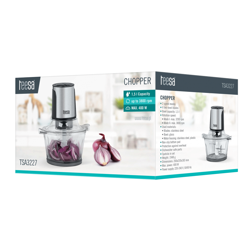 Tees TSA3227 chopperWant to make kitchen work even easier? Stop wasting time cutting products with a simple knife - now the Tesos TSA3227 grinder will do it for you! Give it a try and you'll quickly find out that it's what you've been missing in your lunch or dessert preparations. The maximum power of 400 W and 2 speed modes and 4 stainless steel blades made of two-level Tees shredders quickly cut both hard and soft foods. Convenience In addition, the convenience of your work will be increased by the glass bowl with a capacity of 1.5 l, in which you will chop at the same time a large amount of ingredients, and a spatula to help remove chopped products. Safety Like other products of the Tees brand, the helicopter will also ensure your safety during your culinary work. It must be protected against overheating so that the device is turned off when the engine temperature rises. In addition, the unit is equipped with an anti-slip washer to ensure that it stays where you place it.