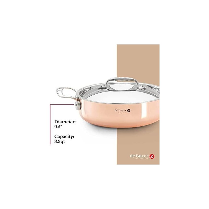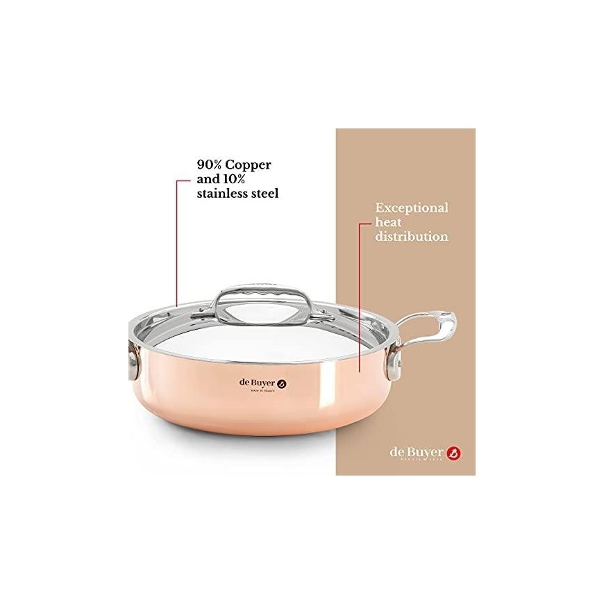 Straight sauté-pan with 2 handles and lid ideal for fast browning, reheating, simmering, for service, display and open kitchens. The straight low edges ensure good evaporation of humidity and excellent caramelisation of juices. Prima Matera cookware composed of 90% copper and 10% AISI 304 stainless steel: - 90% copper on the outside: excellent thermal conductivity for a perfect control of the cooking environment; exceptional cooking results. - 10% stainless steel on the inside: perfectly food grade; eliminates the need to re-tin copper; low proportion of stainless steel which does not alter the properties of copper. 2 riveted handles in cast stainless steel: easy handling; small size; modern design. Innovation: special induction base. Care of copper: use a polishing paste. Care of stainless steel: wash by hand. All cooktops including induction.