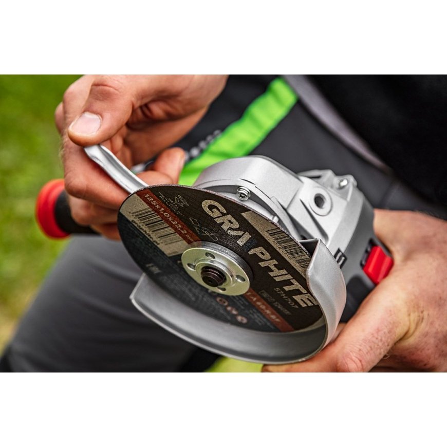 1600W angle grinder, 125 x 22.2 mm wheel, 3000- 11000 min-1, 59G188, GRAPHITE is a high performance tool with speed control for processing of materials widely different in hardness and structure. The tool can cut, grind, and buff or polish various surfaces under a heavy load and with a selection of speed settings. The lowest speed is for processing with wire brushes. The tool is safe with a locked power switch to prevent accidental operation. The comfortable shape and a light weight ensure convenient operation, which is possible with just one hand. A versatile, durable angle grinder to meet the demands of professional users. Product characteristics: Power switch safety lock High motor power Electronic speed control Power maintained in the full speed range Ergonomic body with a comfortable grip Three front handle installation positions for improved working comfort Compliance with European safety standards proven with the CE certificate Long, flexible power cord Overheating protection by strategically located air vents Technical specifications: Power: 1600W Speed: 3000-11000 rpm Wheel diameter: 22.2 mm Spindle size: M14