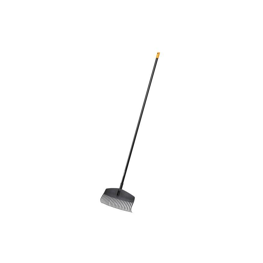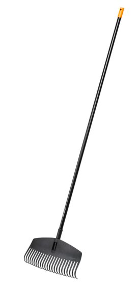 The Fiskars Solid Leaf Rake M is designed for more efficient raking around trees, under bushes and in corners. The flatter shape and straight edges make it easier to rake hard-to-reach corners, while the curved tines reduce leaf and twig snags, so you get the job done faster. The long aluminum shaft is lightweight and comfortable to use, while being durable enough to last season after season. The Fiskars Solid Rake Head 'M' is designed for easier raking around trees, under bushes and in corners. High-quality, strong resin construction and aluminum shaft ensure durability. The tines are curved to prevent leaves, twigs and debris from accumulating between them during raking. 1690 mm long. 23-rod design.