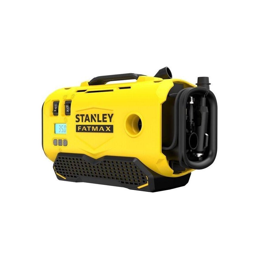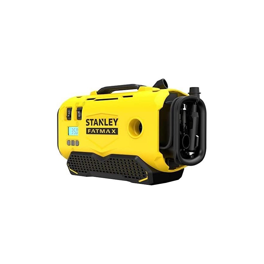 Stanley Fatmax V20 compressor+ High and efficient compressor power; + Possibility to choose a high or low volumetric pressure pumping system; + Flexible power source electrical outlet selection; batteries from the V20 line or car socket; + Long 3.5 m car socket cable; + screw motor (not loud); + Digital psi display and bar; + Automatic shutdown when the set unit psi or bar is reached; + Can pump up to more than 10 Atm (160 + Integrated maintenance; + Surge protection; + Medicine with a strong flexible holder (+ 2 kg); + Medicine can be used anywhere; + Used for vacations, motorsport; construction, car;