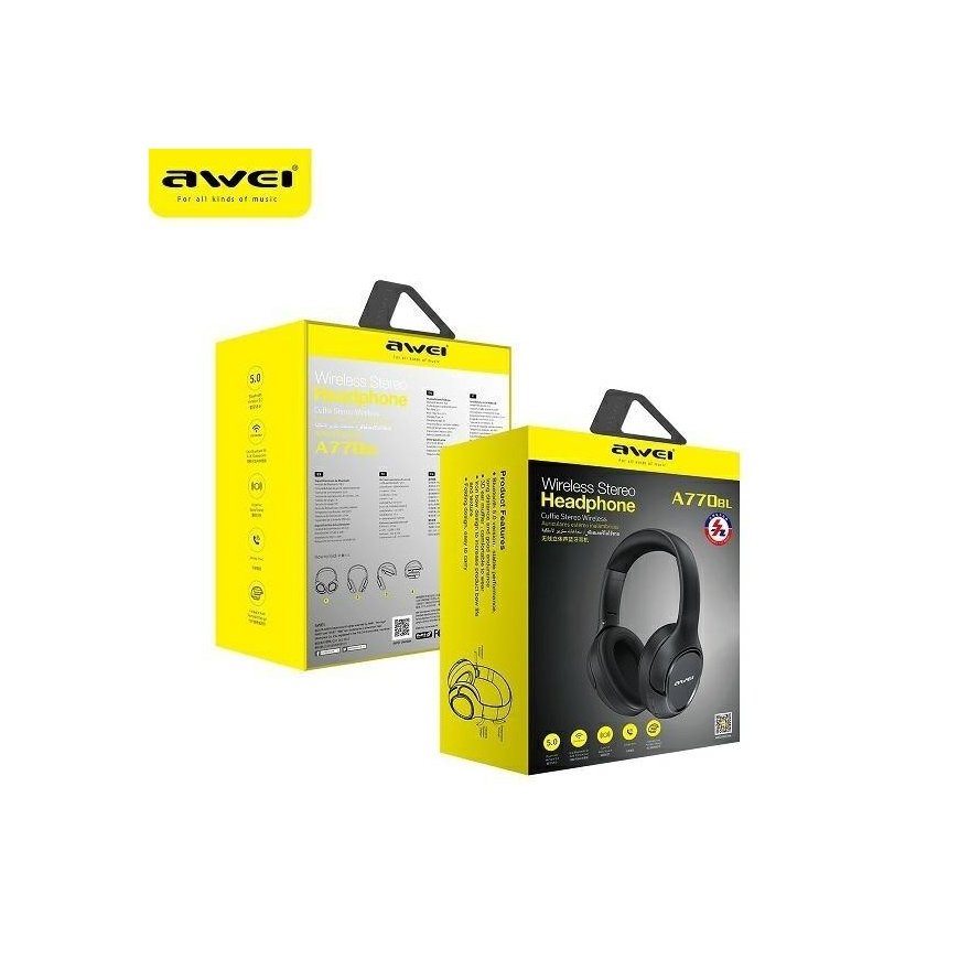 AWEI A770BL wireless Bluetooth stereo headphones guarantee impressive sound quality both from devices with Bluetooth function and through the AUX port. Clear and dynamic sound will surprise the most demanding users. The foldable design saves space on your desk or in your bag. Pleasant to the touch leather material, allows for a perfect fit and provides excellent durability. Functions: Answering calls, Bluetooth, microphone, music control, volume control Specification: Working time: about 12-13 h Standby time: 100 h Charging time: 1 h Bluetooth Version: 5.0 Bluetooth Range: 10m Impedance: 32 Ohm ± 15% Sensitivity: 122 dB ± 3 Diaphragm: 2 x 40 mm. Frequency range: 20 Hz - 20 KHz Connection: wired and wireless Battery capacity: lithium ion 250 mAh Supported protocols: HFP, A2DP, AVRCP Port: AUX / MicroUSB Charging method: USB Material: PC, ABS, eco-leather