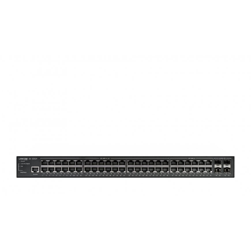 Performance and cost optimization on 52 ports The LANCOM GS-3252P is equipped with 48 Gigabit Ethernet ports and 4 SFP+ ports. With a data throughput of 176 Gbps on the backplane, it offers full performance even at high workloads. The switch thus forms the basis for modern network infrastructures with a large number of end devices with moderate data throughput, such as printers or IP telephones, which need to be integrated.