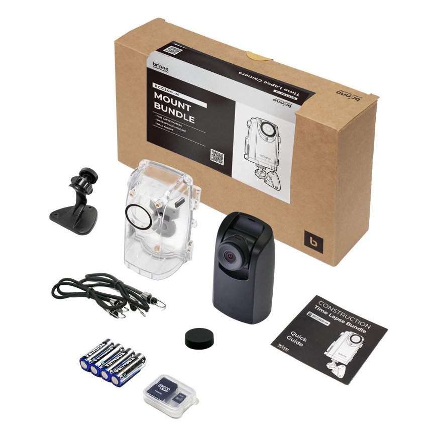 Brinno TLC300 comes with batteries, a memory card and a lens cover. The camera is easy to install in a few minutes. The bracket bundle also comes with a weatherproof case and a wall bracket.