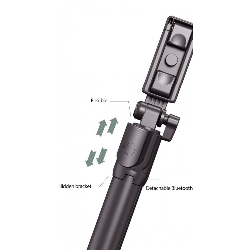 A selfie stick with a tripod function with a wireless remote control that allows you to take photos and record videos without using the shutter button on your phone.