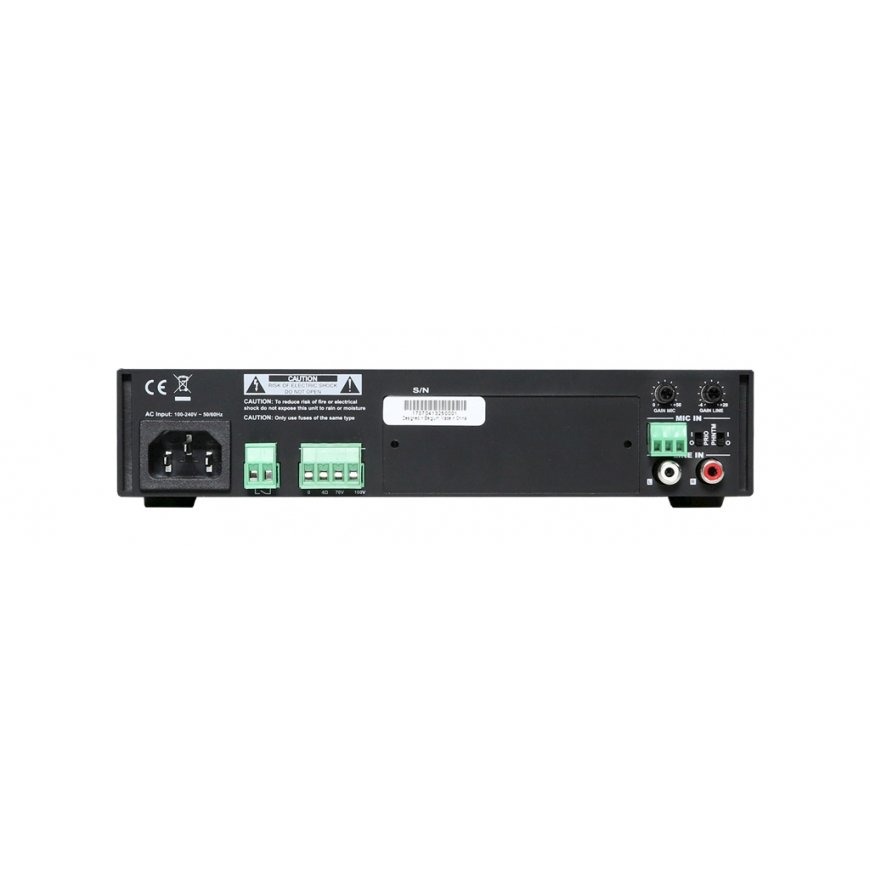 The amplifier is designed using Class-D amplifier technology and delivers an output power of 80 Watt to constant voltage (100V and 70V) or low impedance (4 Ohm) audio systems. A switch mode power supply allows compatibility with a wide variation of mains voltages for global compatibility.