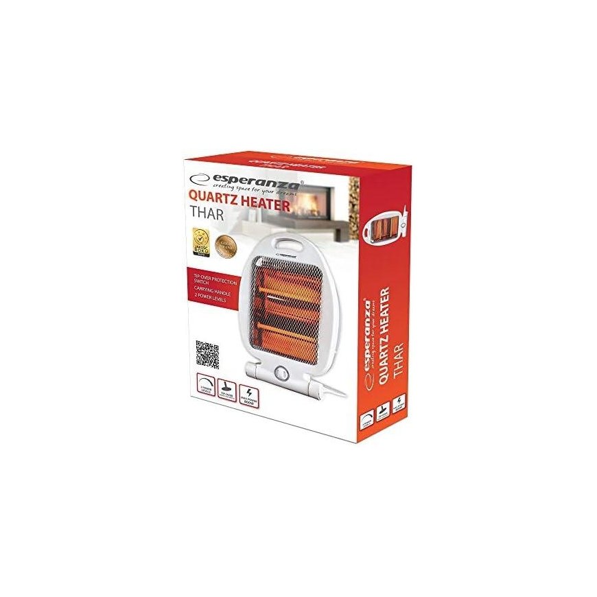 Esperanza Quartz Heater 400W/800W TharOur fan is the perfect solution for heating your home. It will quickly and efficiently heat the bathroom or the child's room on cold days. Its small size will also fit in a campsite or on the property. and the modern look will decorate any interior. Voltage: 220/240V Frequency: 50/60Hz Power: 400W/800W Safety lever switch Carrying handle Power cord: 1.2m Type: quartz heater Maximum power 800W Minimum power 400W Overheating protection: Yes Thermostat: No Timer: No Vibration: Yes Cold burst Item: off-white colorDimensions : 25 x 9.5 x 39.5 cm