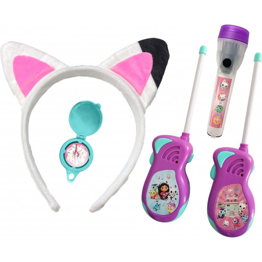 Jump into the delightful world of Gabby's Dollhouse with a versatile adventure set! The playset includes ears, a compass, a flashlight and walkie-talkies.