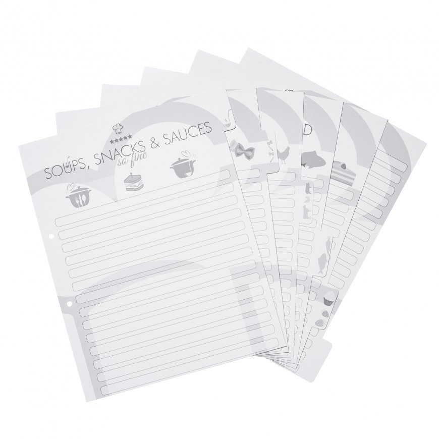 The HERMA "Cooking with Love" motif file in A4 format offers plenty of space for your favourite baking and cooking recipes and is suitable for all transparent pockets with standard perforations. This keeps recipes well protected from splashes and fingerprints. With the practical 6-part index, recipes, ideas, tips and tricks can be easily classified and found again. The index is divided into "Soups, Snacks & Sauces", "Pasta & Co.", "Meat", "Veggies <(>&<)> Seafood", "Dessert" and a free page for writing by yourself. Ideal for all those who like to cook, try out new things in the kitchen or just want to experiment. The decorative file in a bright design is made of sturdy cardboard, with a high-quality lever arch mechanism, compressor bar and is finished with gold foil - an eye-catcher on the kitchen shelf. Especially clever: the stick-on pocket inside for important notes and more.