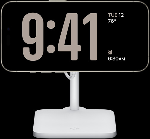 StandBy turns your iPhone into a new, full-screen experience with glanceable information you can see from a distance. Just set it on its side while charging to display the time, showcase your favorite photos, or keep an eye on your widgets. Thanks to Always‑On display, it’s persistent. But at night, the screen dims so you can sleep easy.