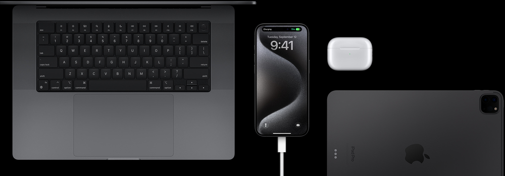 The new USB‑C connector lets you charge your Mac or iPad with the same cable you use to charge iPhone 15 Pro. Bye‑bye, cable clutter.