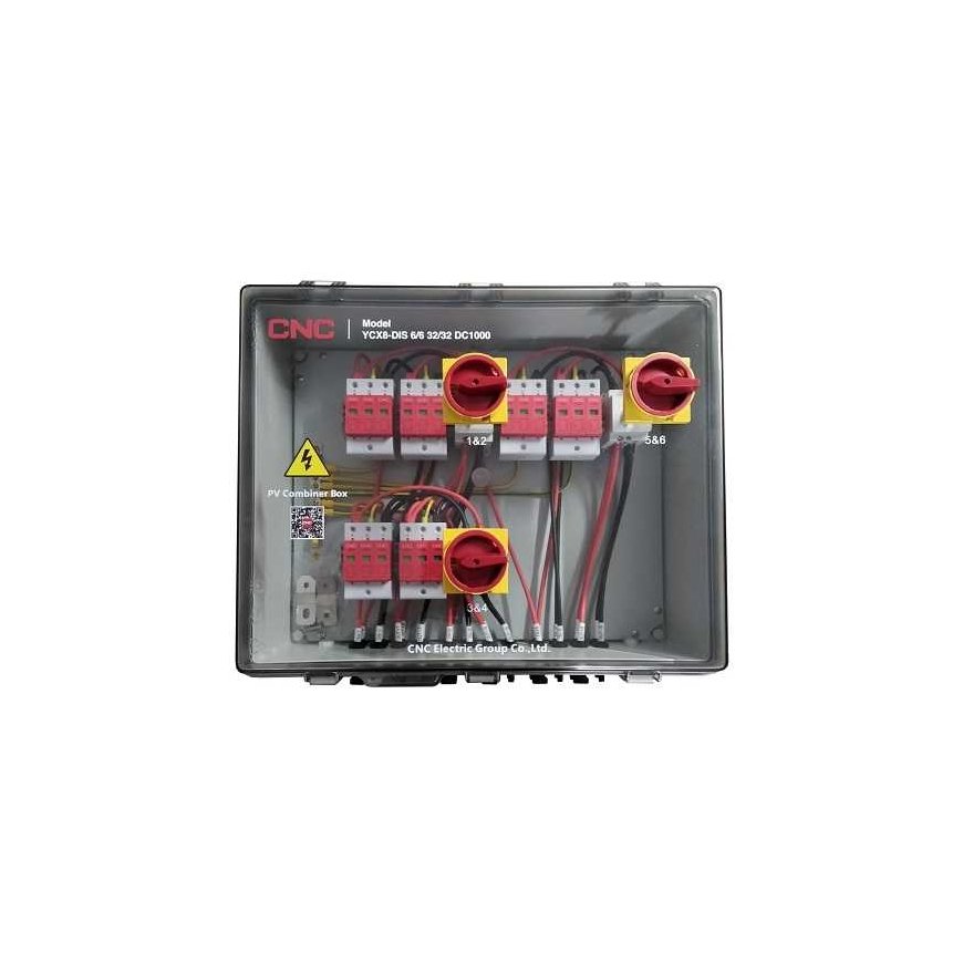 PV disconnect panel, DC 6in-6out Features: 6 inputs 6 outputs 1000V DC. DC junction box for 6-in/6-out PV system. Designed for surge protection and isolation of the DC side of solar power. Resistant to UV rays, water and dust IP66, shockproof, non-flammable V0. With MC4 connectors. Box size 528 x 458 x 358 mm, standards IEC60529.