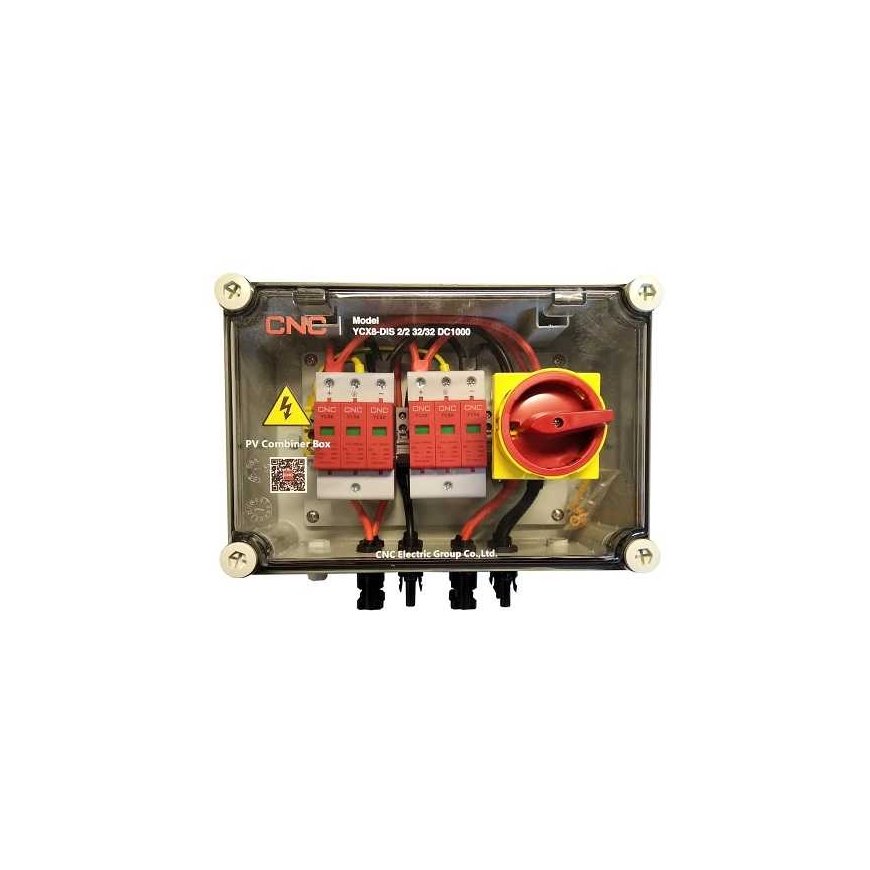 PV disconnect panel, DC 2in-2out Features: 2 inputs 2 outputs 1000V DC. DC junction box for 2-in/2-out PV system. Designed for surge protection and isolation of the DC side of solar power. Resistant to UV rays, water and dust IP67, shockproof, non-flammable V0. With MC4 connectors. Box size 280 x 190 x 130 mm, standards IEC529, EN60529, CE, RoHS.