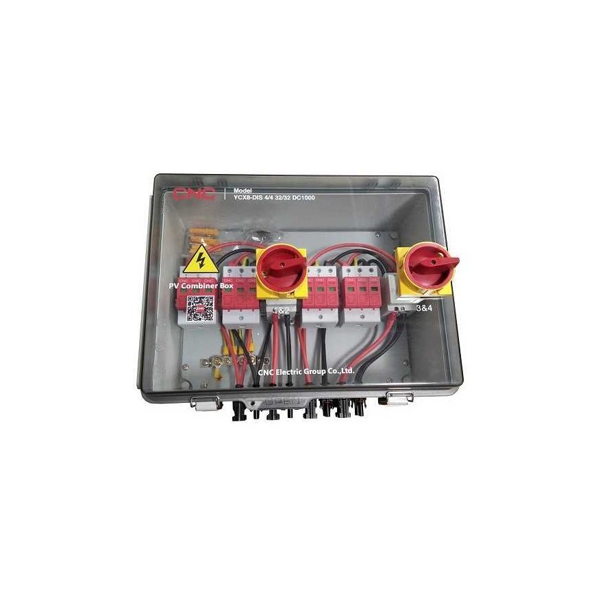 PV disconnect panel, DC 4in-4out Features: 4 inputs 4 outputs 1000V DC. DC junction box for 4-in/4-out PV system. Designed for surge protection and isolation of the DC side of solar power. Resistant to UV rays, water and dust IP66, shockproof, non-flammable V0. With MC4 connectors. Box size 428 x 358 x 258 mm, standards IEC60529.