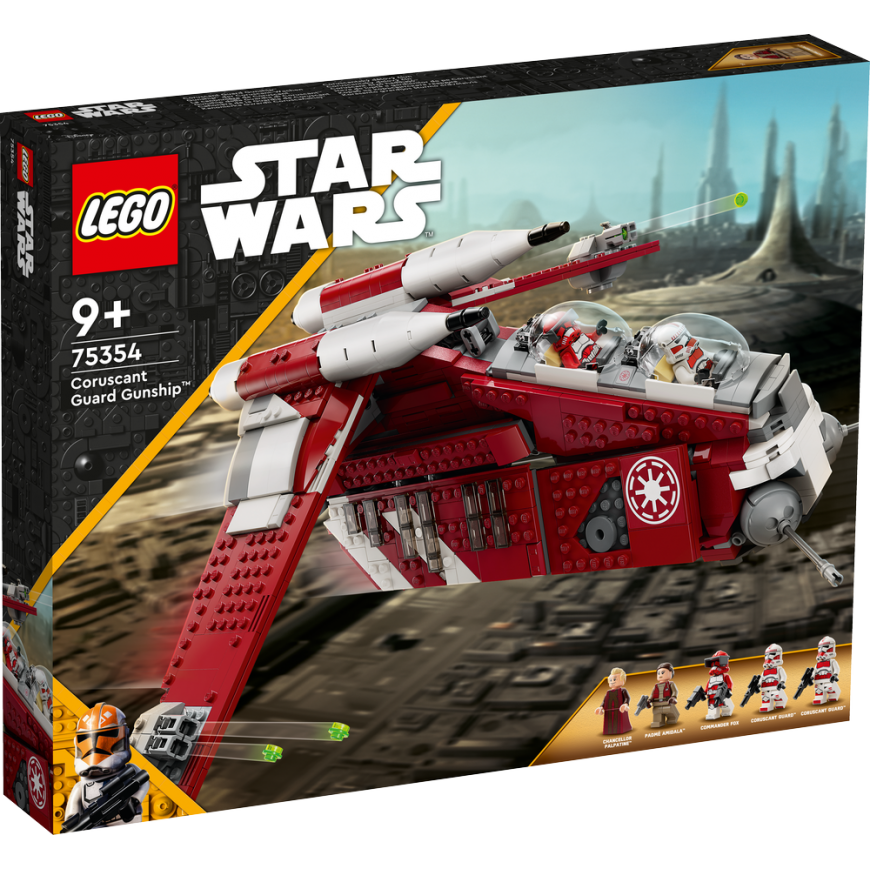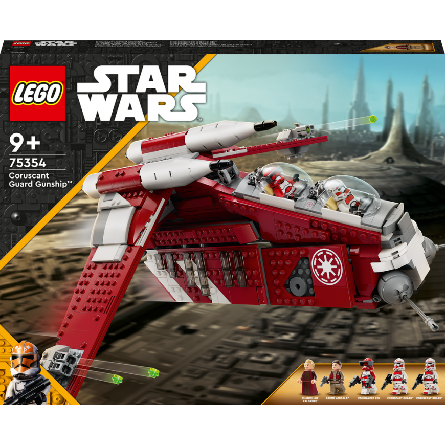 Fans can lead their own Star Wars: The Clone Wars missions with this LEGO® brick-built Corasant Guard Assault Spacecraft (75354). The spaceship includes 2 cockpits, 2 spike shooters, 2 customizable cannons and a handle for flying. A rear hatch and a sliding side panel allow easy access to the cabin, which has room for soldiers. Featuring 5 LEGO minifigures including Commander Fox, Chancellor Palpatine and Padmé Amidala, plus 3 laser guns and 2 explosive devices for action play, this set is the ultimate Star Wars™ gift for kids aged 9 and up.Digital instructions Download the LEGO Builder app, to make the creative experience even more fun. It includes a digital step-by-step building guide, easy zoom and rotate tools to help kids imagine the real model they're building and more. Cool builders The LEGO Group have been creating iconic spaceships, vehicles, locations and characters from the Star Wars universe since 1999. The wide range will surprise fans of all ages.
