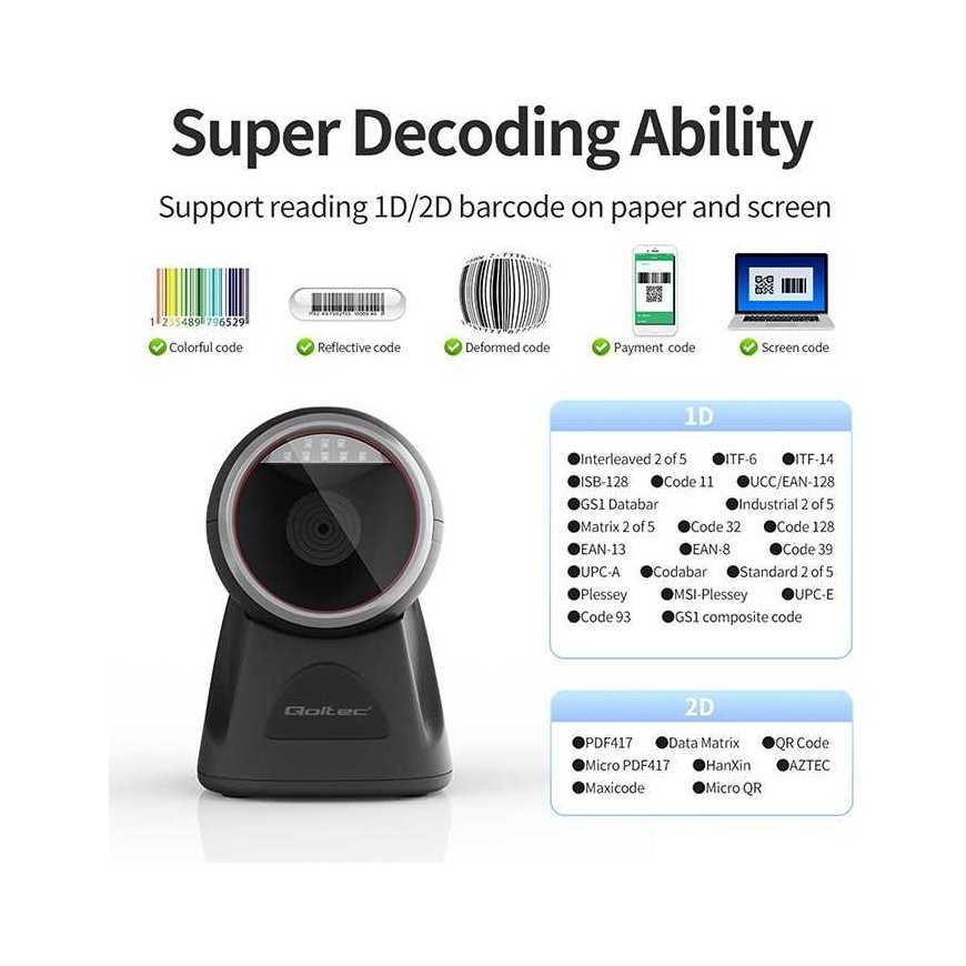 The stationary Qoltec barcode scanner is fast, accurate and extremely easy to use. In addition, the scanner is compatible with many devices and standards . Regardless of whether you want to scan a 1D or 2D code , our scanner can handle it, just place the product on it and confirm the reading of the information encoded in the code with one click.