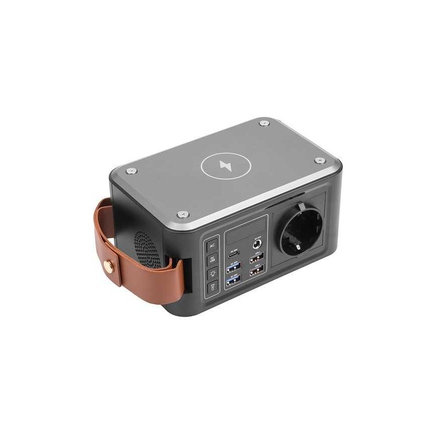 Technical data: Battery capacity: 88.8Wh, 6Ah/14.8V equivalent to 24000mAh/3.7V. Battery type: Li-ion. Plug type: EU. Inputs: DC: 19V/ 1.5A. Solar DC: 16.5-23.5V / 1.3A max. Outputs: AC: max. 80W/ 120W (modified sinusoid). USB Type-A1: 5V/2.4A. USB Type-A2: 5V/2.4A. USB Type-A3: (QC3.0) 5V-12V/ 2A. USB Type-A4: (QC3.0) 5V-12V/ 2A. USB Type-C: (PD3.0) 5V/ 3A, 9V/ 2A, 12V/ 1.5A (max. 18W). USB Type-A1+USB Type-A2: max. 4.8A. USB Type-A3+USB Type-A4: max. 5V/3A, 15W. Wireless charging: 5V/ 1A, 9V/ 1.2A (max. 10W). Built-in dual LED flashlight. Certificates: CE, FCC, RoHS. Dimensions: 157.8x82.2x102.3 mm. Weight: 1120 g. Color: black/grey.