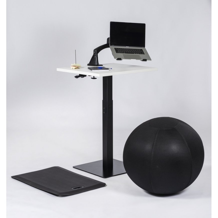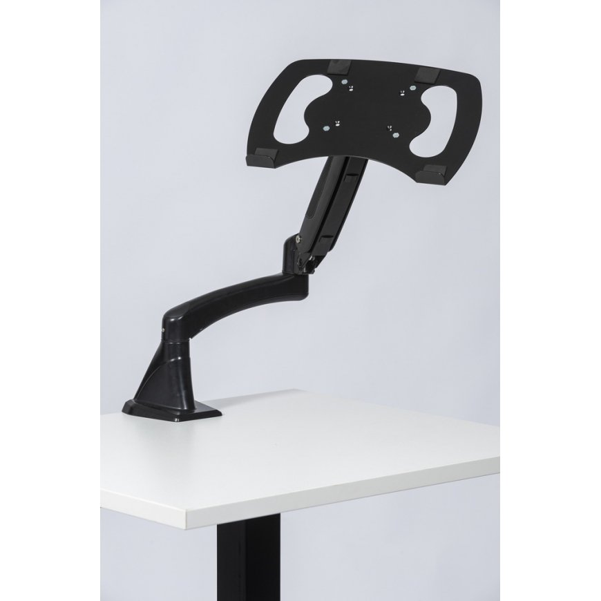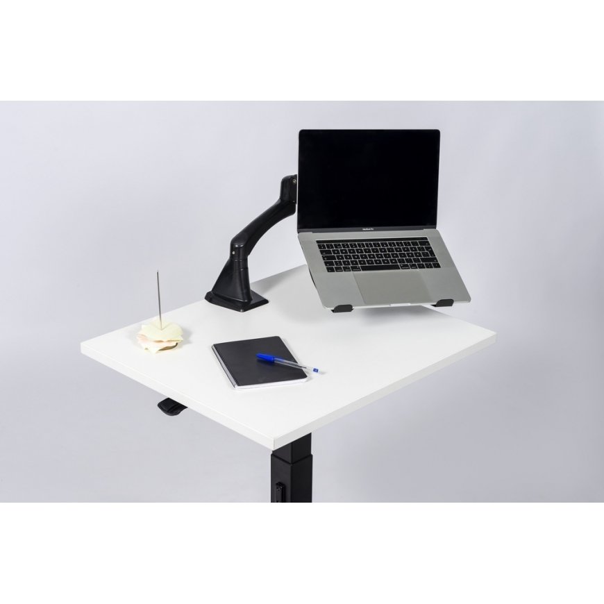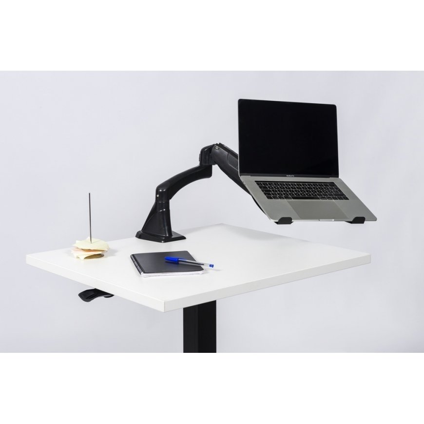 A laptop stand that can be attached to the monitor arm, which allows you to use the laptop screen at an ergonomic height while working. The metal laptop stand is sturdy and has VESA standard m