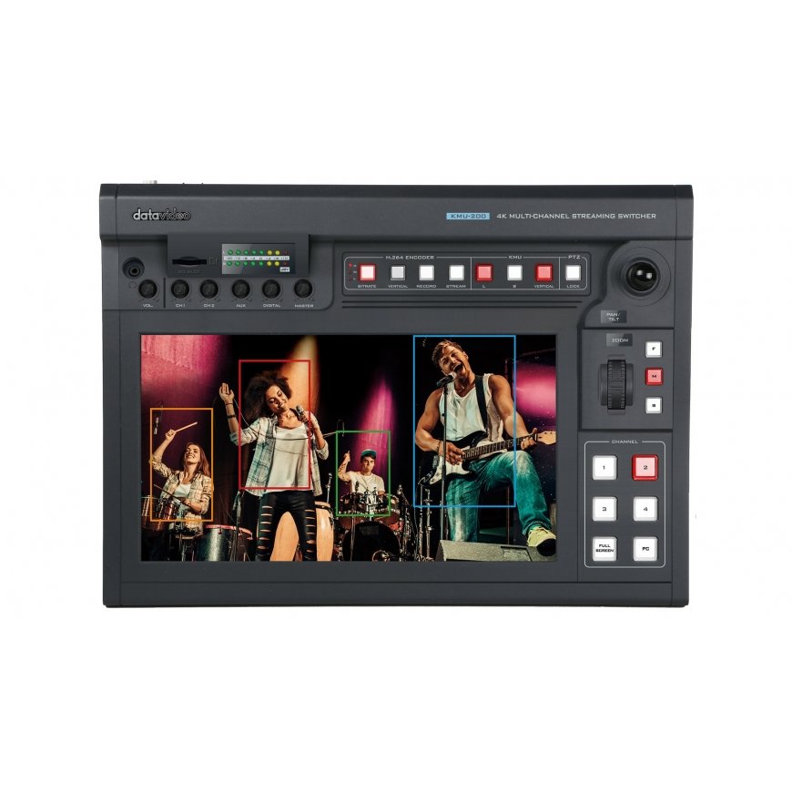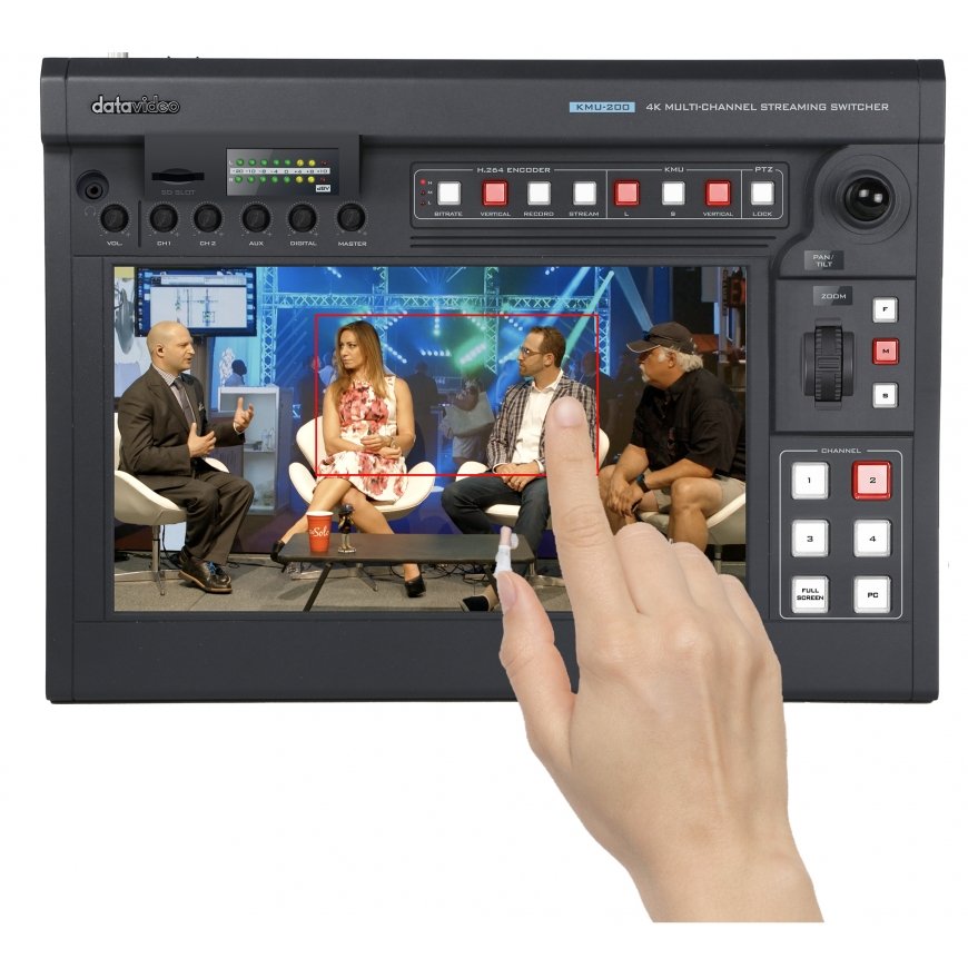 Producing full HD virtual multi-camera video using a single 4K camera KMU-200 is an all-in-one solution for producing full HD virtual multi-camera video using a single 4K camera. KMU-200 uses a large touch screen for operation using similar gestures used on any tablet or phone. By pinching and swiping, you control up to 4 cutouts of a 4K image and as if the footages comes from 4 different cameras. Use hardware control to precisely position the cutouts like a regular PTZ camera. KMU-200 features a dual streaming encoder making it possible to go live on all the well known streaming platforms directly from the device. Easily record on SD cards and you can directly bring the recording to your favorite editing suite. KMU-200 allows you to produce virtual multi-camera videos easily without any help. Producing full HD virtual multi-camera video using a single 4K camera