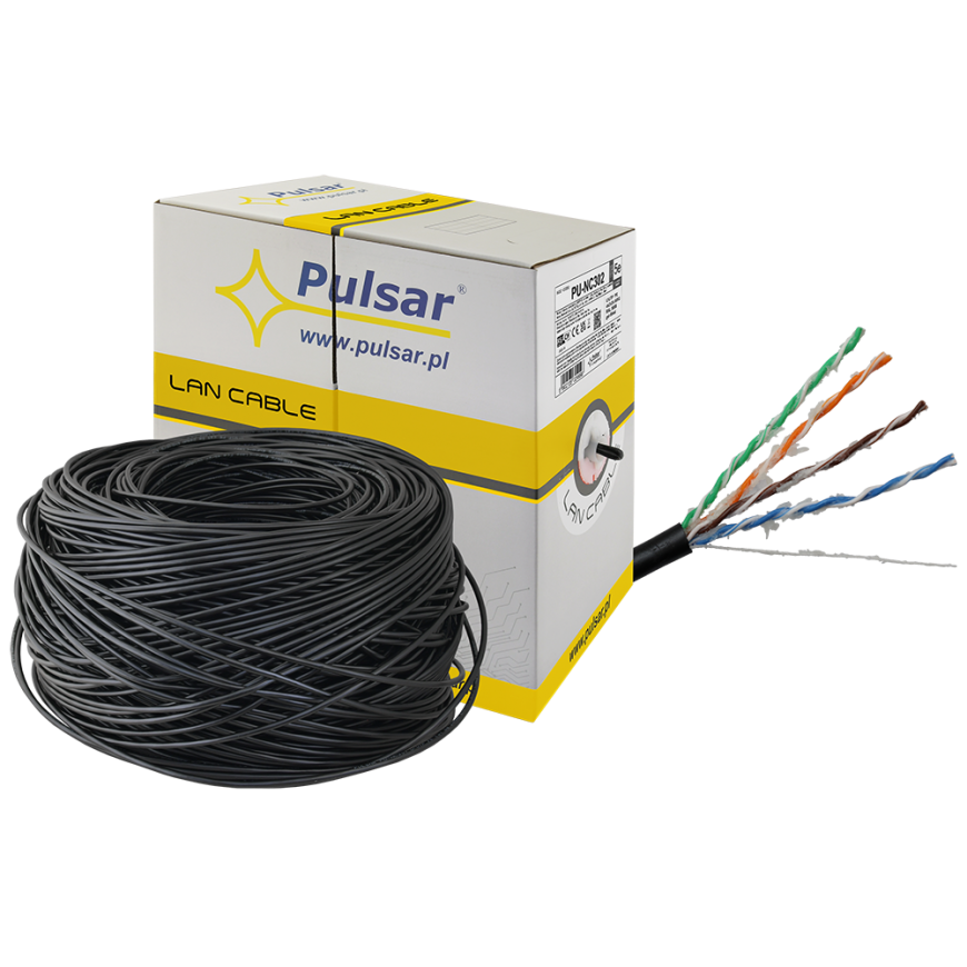 PU-NC302 Twisted pair, U/UTP, PE, gel, cat 5e, 24AWG, Cu, Fca, 305m, (outdoor) The PU-NC302 cable is a gel twisted pair, U/UTP, category 5e. It can be used as a data transmission and power transmission (PoE) medium. The scope of application includes a wide range of systems, such as: ICT systems, IP video surveillance systems (especially recommended for IP PoE systems), but it will also work in HD digital CCTV systems (CVI, TVI, AHD). The cable is designed for professional installations outside buildings and complies with the PN-EN 50575 (CPR) standard. Technical data: Cable type Twisted pair Screen type / Screen U/UTP (unshielded cable) Category 5e Diameter: external. wire / wire 5.3mm / 0.5mm (AWG24) Sheath / wire material: PE / Cu (99.99%) - gel-filled Coating color Black - RAL9005 Fire reaction class Fca For outdoor use Operating temperature -20OC÷50OC Installation temperature -20OC÷50OC Bending radius 40mm Cable length in package 305m Type / package dimensions Carton / 370 x 375 x 220 [+/- 2mm] Net / gross weight 8.7 / 9.8 [kg] Declarations, warranty CE, CPR , DoP, 5 years Comments marker on the cable every 1m Usage: