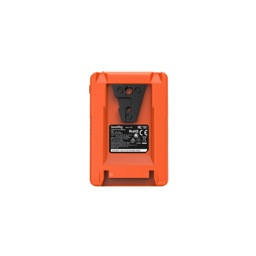 SmallRig VB50 mini V Mount Battery (Orange) 4871 is a compact V-mount battery featuring a highly integrated design that effectively reduces the battery's overall size, making it lightweight and portable. It features LG A-grade 18650 high-rate cells, ensuring accurate capacity, cycle performance, and exceptional stability. Designed to meet international standards such as MSDS / UN38.3 / IEC 62133 / UL2054 / UL 62368, it has obtained certifications including CCC / FCC / CE / RoHS / ISED / RCM / PSE / KC / BIS / TISI, ensuring safe and reliable operation for users. The battery is equipped with a BP, a D-Tap, an 8V-OUT DC, a 12V-OUT DC, a USB-C, and a USB-A ports offering a wide range of interfaces for powering multiple devices simultaneously. This includes cameras, mirrorless cameras, monitors, transmitters, video lights, smartphones, tablets, laptops, and more, providing integrated and efficient power supply for all your needs. The battery features a highly integrated fast-charging protocol chip, MCU, boost/buck control chip, and Battery Management System (BMS), offering multiple protections including overcurrent, short circuit, over-temperature, and over-voltage. Additionally, it supports various fast-charging protocols such as PD, QC, and PPS, and enables 45W USB-C bi-directional PD fast charging. The battery exterior is made of fire-resistant PC material, heat-resistant, and flame-retardant, ensuring durability. It features an OLED screen that clearly displays battery level, remaining usage time, voltage, power, and other information, allowing you to accurately monitor the battery status. Featuring a suite of robust safety features, this device instills the confidence to capture every memorable moment with precision and reliability.