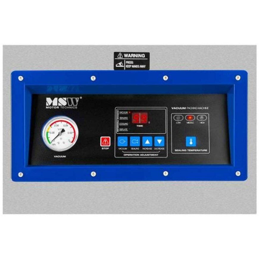 Pay 5x238.99€A commercial vacuum packaging machine allows you to quickly and efficiently seal food, medicine or jewelry in hermetically sealed bags. This protects the products from moisture, dirt and even aerobic bacteria. The device's power of 900 W ensures efficient work, and the pump reaches a performance of 20 m³/h. The chamber (440 x 445 x 65 mm) and the welding belt (400 x 15 mm) allow packing products of various sizes. Control is via a clear digital control panel that allows selection of welding temperature (low/medium/high), vacuum time (0 - 99s) and welding time (0 - 9.9s). This allows you to adapt the packaging process according to the characteristics of the product and the thickness of the bags, avoiding damage to them. The device is made of strong stainless steel, resistant to mechanical damage and corrosion, easy to clean. The transparent cover allows you to monitor the process in the chamber. Stability is ensured by four rubber feet that protect the work surface from scratches. The set includes foil bags (10 pcs), tools and spare parts. Also included is a set of numbers and letters useful for labeling packages. Just place them under the cover gasket.