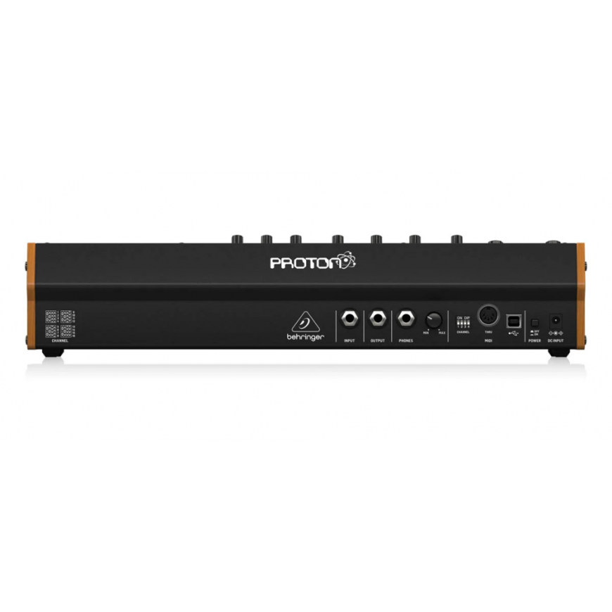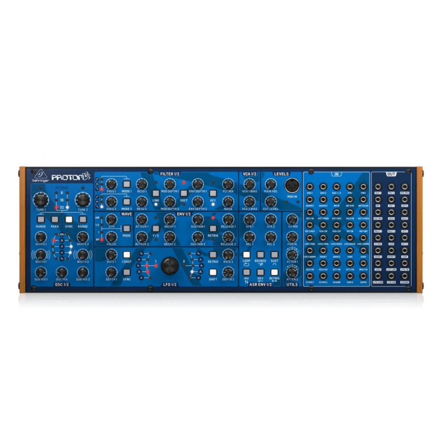 Behringer PROTON is an analog, semi-modular synthesizer with dual VCO, dual VCF filter and four envelope generators. Eurorack standard body.Positively charge your setup with the new Behringer PROTON instrument! This analog paraphonic semi-modular synth is sure to become the new foundation for your entire setup! Equipped with two VCOs, multi-mode VCF filters and a wide range of possible connections that will make all the electrons in the room dance! Carefully thought out design allows PROTON to take full advantage of the semi-modular structure, which does not need to be fixed before playing. Simply put the PROTON into osylactor excitation mode, connect your favorite keyboard or computer via MIDI, and start exploring the world of analog synthesis right away. Two ASR envelopes, each with invert/reverse/loop/reject functions, provide VCA and waveform control, while two analog ADSR oscillators provide unique audio performance with VCF modulation.Key Features:Analog synth with dual VCOs for ultra-rich sound; Paraphonic mode allows independent control of both oscillators for multi-tone sounds;Semi-modular design requires no patching for immediate playability;Fully analog audio path based on authentic VCO, VCF and VCA design; Dual oscillators with 5 waveforms, jitter sync, pulse width modulation and separate sub-oscillators; Smooth oscillator waveform control (tone mode, pulse, sawtooth, triangle and sine); 2 self Excited VCF filters can be configured in parallel or series controlled via CV connector; 2 ASR envelopes with reverse/inverse/loop/reject capabilities for VCA control and wavefolder mode; 2 analog ADSR oscillators that modulate VCFs for a unique sound; Wavefolder mode gives LFOs rich harmonic content and flexibility; 2 flexible LFOs with 5 waveforms, MIDI clock sync, key synchronization, phase and depth control; The noise generator significantly expands waveform generation capabilities;External audio source can be summed to one or both VCFs to enhance audio generation;Useful features include faders, multipliers, signal/CV mixer and switch for creative tweakingExternal audio input with level control and smooth waveform clipping for external audio source processing ;64 patch points for advanced modular communication and integration with peripherals;68 controls that provide direct real-time access to all key parameters; Complete Eurorack solution - the main module can be moved to a standard Eurorack enclosure; Universal MIDI implementation with MIDI channel selection.