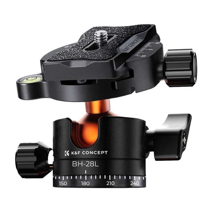 The tripod is equipped with a K&F Concept BH-28L ball head, which has a maximum load of up to 10 kg. This head has a thread diameter of 2.8 cm and a ⅜" connection, which ensures compatibility with a wide range of photographic equipment.