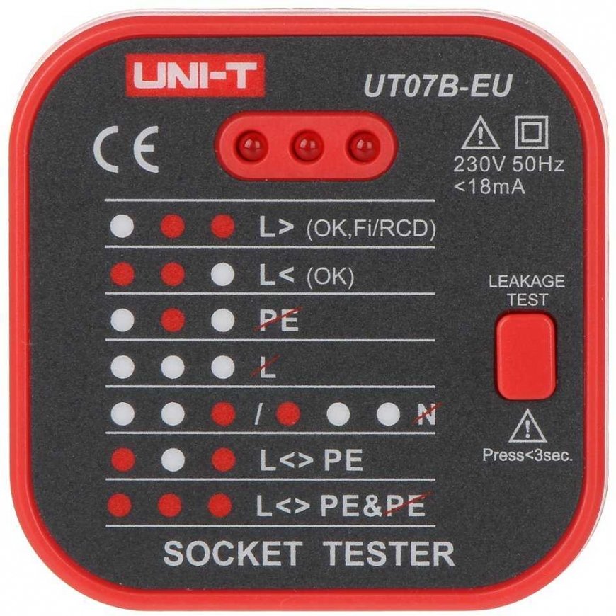 The UT-07B-EU tester indicates the suitability of the wire connection L, N, PE in the electrical outlet.