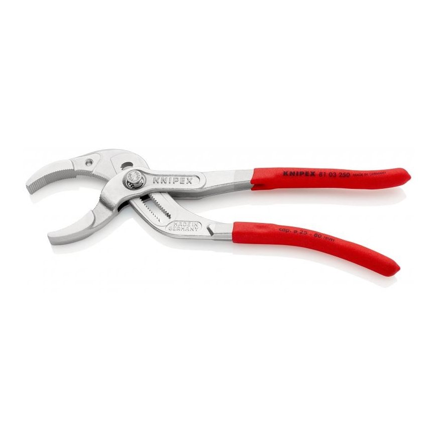 With the 25 possible settings, which can be conveniently set to the desired grip width using the fine adjustment push button, the Knipex siphon and connector pliers have a large gripping range of Ø 25 - 80 mm. Thanks to the box joint design and manufacture from oil-hardened chrome vanadium electric steel, the pliers are very tough. Siphon and connector pliers from Knipex