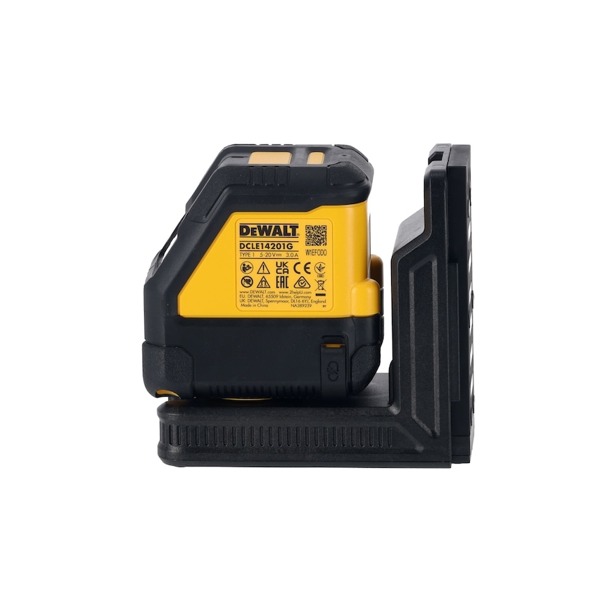 The DEWALT DCLE14201GB-XJ USB Cross Line Green Beam Laser is a lightweight, 45m ranged cross line laser that incorporates POWERSTACK™ Technology. The integrated USB battery, charged by USB-C Cable, utilises POWERSTACK™ battery technology to last a minimum of 11 hours when fully charged. Even though the laser can be used when plugged in, it will achieve 80% charge in as little as 30 minutes. \n\nThe DCLE14201 delivers a green cross line beam that has a working range of 45m or 100m when used with a detector. With an enhanced accuracy of +/- 3mm @ 10m, the laser provides professional accuracy and ensures precision when on the job.\n\nAs well as Manual Slope, Self Level and Pendulum Lock, the USB Cross Line Green Beam Laser includes a beam brightness adjustment control to suit general lighting conditions on site, while the pivotable bracket with magnets that offer a flush attachment to either metal tracking or to steel works.\n\nWith IP65 rating to protect it against the elements, the DCLE14201 can also be attached to a tripod thanks to the 1/4” or 5/8” tripod thread on the bracket.