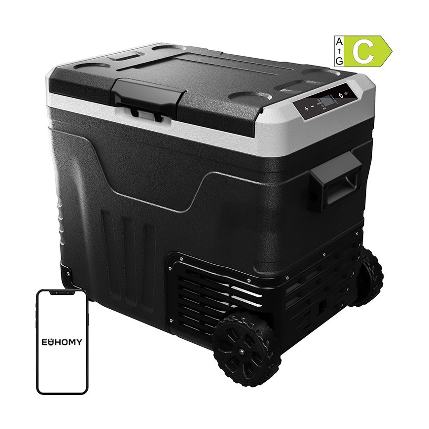 Pay 5x47.80€Euhomy CF003 from the CFB series is a 12V car refrigerator that combines robust cooling with the convenience of transportation. Its capacity of about 50 liters is great for family trips, weekend getaways or longer car journeys. Built-in wheels and a telescopic handle make it a mobile mini-refrigerator set that you can pull like a suitcase. The controls are intuitive thanks to the touch panel and mobile app, and the practical interior design allows you to organize every meal or your favorite drinks.