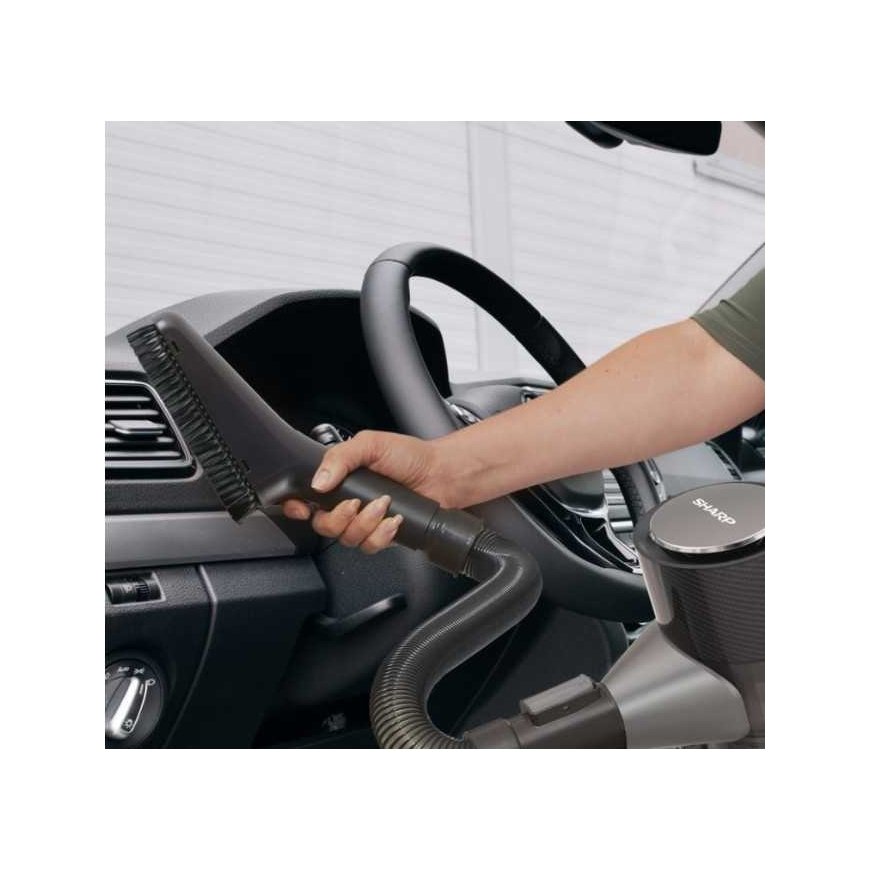 Universal "Sharp SA-VP4251GS" 2in1 vertical vacuum cleaner: vacuums, works as a handheld vacuum cleaner with additional attachments for car cleaning. Equipped with a 300 W motor and a 2000 mAh lithium-ion battery, ensuring quiet operation for up to 65 minutes. The filtration system with HEPA E12 filter takes care of air purity, while the electric brush with tangle protection makes cleaning easier. The "Sharp SA-VP4251GS" is a versatile 2in1 device that combines the functions of a vertical and handheld vacuum cleaner. It features a 300 W brushless inverter motor and a 2000 mAh lithium-ion battery, providing up to 65 minutes of runtime. The adjustable telescopic tube with seven levels of length adjustment (from 890 to 1100 mm) allows for length adjustment according to the user's height, and the vertical parking function facilitates storage. Thanks to the innovative solution, the electric brush with LED backlight prevents hair and fur tangling around the brush, while the 4-stage filtration system with HEPA E12 filter collects 99.5% of dirt. The 0.75-liter dust container is easy to empty, and the battery charging time is about 4–6 hours. The "Sharp SA-VP4251GS" vertical vacuum cleaner tackles messes at home and in the car. The "Sharp SA-VP4251GS" vertical vacuum cleaner is an excellent solution for those looking for a device that works both at home and in the car. With practical nozzles and a brush set, the cordless vacuum cleaner allows for thorough cleaning of various surfaces, including hard-to-reach areas in the car, such as glove compartments, ventilation grilles, or gaps around seats. The cordless design and the ability to transform into a handheld vacuum cleaner allow for comfortable and efficient cleaning, regardless of the location of use. Hygienic cleanliness and working comfort: lithium-ion battery; up to 65 minutes of operation without charging; high-class HEPA E12 filter; quiet operation (up to 78 dB+) in turbo mode; lightweight (3.85 kg) and self-standing construction; interchangeable nozzles and car kit; 750 ml dust collection container with easy emptying; one charge and up to 65 minutes of operation. Thanks to the modern 2000 mAh lithium-ion battery, the "Sharp SA-VP4251GS" vertical vacuum cleaner offers up to 65 minutes of continuous operation in eco mode, allowing for cleaning a large area on a single charge. For more intensive cleaning, the turbo mode ensures 12 minutes of operation at maximum power. The full battery charging time is approximately 4–6 hours, allowing you to quickly prepare the device for the next use. Functional and convenient design. The cordless "Sharp SA-VP4251GS" vacuum cleaner is designed with maximum user comfort in mind. The telescopic tube with 7 levels of length adjustment allows you to adjust the tube according to individual needs, ensuring comfort during cleaning. The vertical parking function allows you to easily place the vacuum cleaner anywhere without needing to lean it against a wall or use a stand. The colored LCD screen will inform you about battery status and operating modes. Additionally, the electric brush with LED backlight for tangle prevention facilitates cleaning in poorly lit areas, while the 4-stage filtration system ensures the purity of the blown air. It is an excellent vacuum cleaner for allergy sufferers and particularly sensitive individuals.