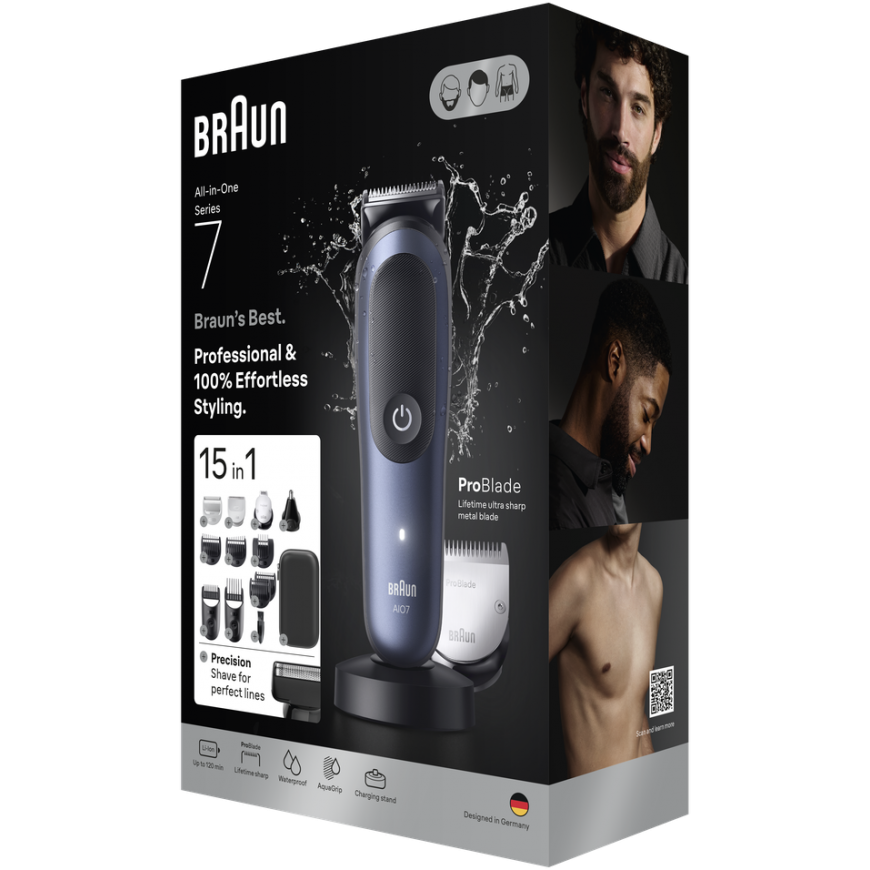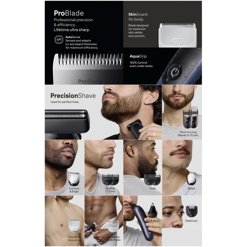 „ ProBlade “ Sharp throughout the entire lifespan. „ SkinGuard “ for the body Reduces the risk of cuts and nicks. „ PrecisionShave “ Precise lines. Shaving The “PrecisionShave” head shaves cleanly and accurately. Body and sensitive areas Sensitive Body attachment designed for gentle trimming in sensitive areas. Detailing With the “ProDetail” trimmer, you can shave thoroughly. Face The ear and nose hair trimmer won't miss a single hair. Shape your eyebrows with the included eyebrow attachment. Beard, Body, Hair, Face 15 in one Professional styling from head to toe. Adjustable attachment 3–21 mm, Multi-day beard attachment, “ProDetail” trimmer, “PrecisionShave” head, Beard thinning attachment, Cleaning brush, Attachment for sensitive body areas, “SkinGuard” trimmer, Eyebrow attachment, Ear and nose hair trimmer, Charging stand, Case