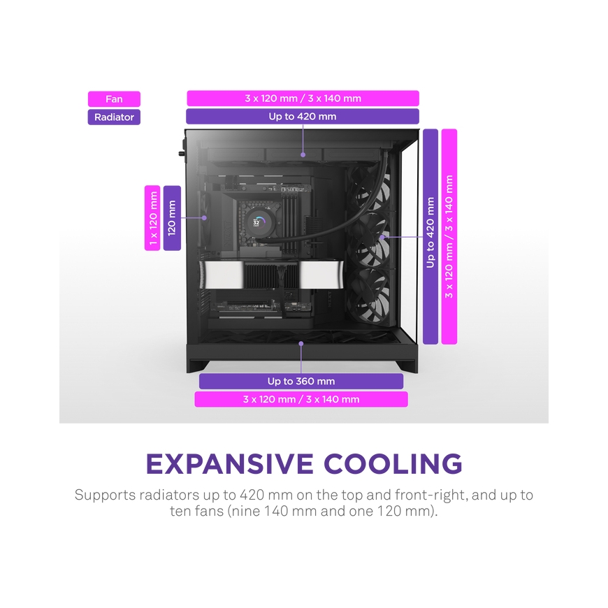 Holds up to 420 mm radiators on the top and front-right panels for versatile cooling.